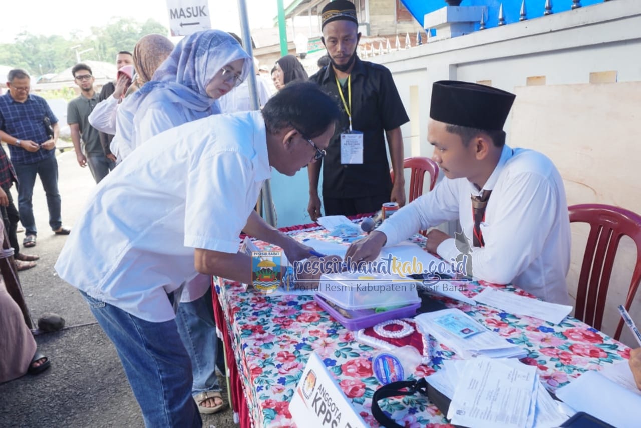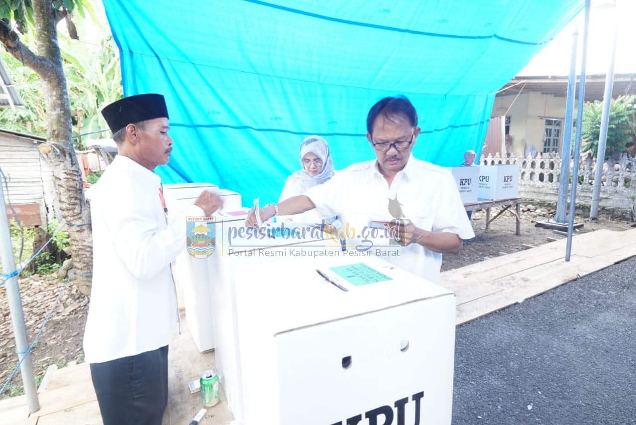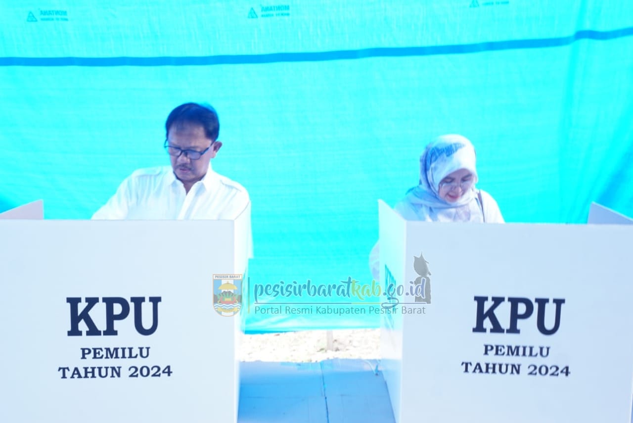 PESISIR BARAT-Kepala Dinas Komunikasi, Informatika, Statistik, dan Persandian (Diskominfotiksan), Suryadi, S.IP., M.M., menginformasikan bahwa, Bupati Pesisir Barat (Pesibar), Dr. Drs. Agus Istiqlal, S.H., M.H., bersama Ketua Tim Penggerak-Pemberdayaan Kesejahteraan Keluarga (TP-PKK) Pesibar, Septi Istiqlal, menyalurkan hak pilihnya di Tempat Pemungutan Suara (TPS) 2 Pekon Gunung Kemala Kecamatan Way Krui, Rabu (14/2/2024).