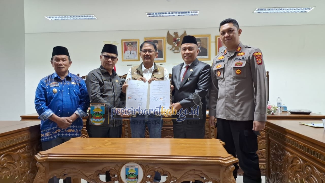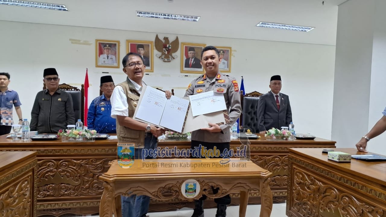 PESISIR BARAT-Kepala Dinas Komunikasi, Informatika, Statistik dan Persandian (Diskominfotiksan), Suryadi, S.IP., M.M., menginformasikan bahwa, Bupati Pesisir Barat (Pesibar), Dr. Drs. Agus Istiqlal, S.H., M.H., menghadiri serah terima bangunan aula Polres Pesibar dan penandatanganan nota perjanjian hibah daerah, di ruang rapat Bupati Lantai 4 Gedung A Komplek Perkantoran Pemkab Pesibar, Jumat (16/8/2024).