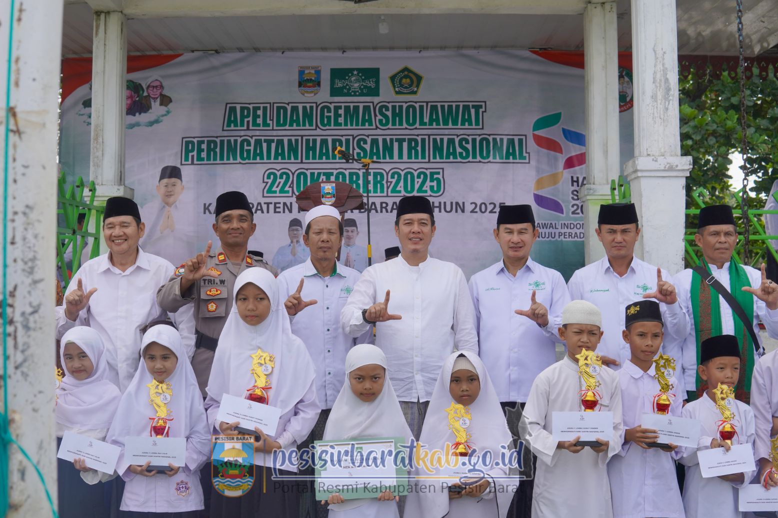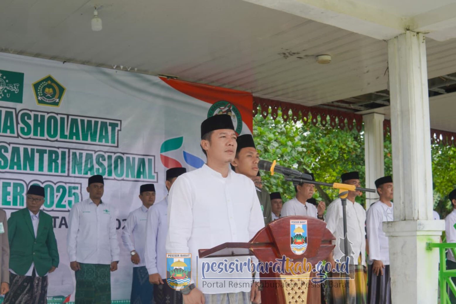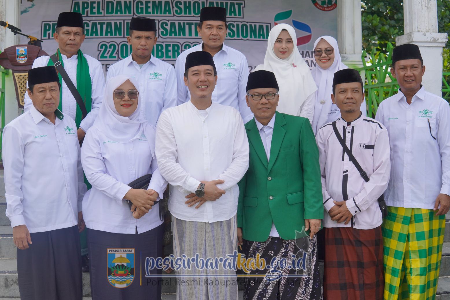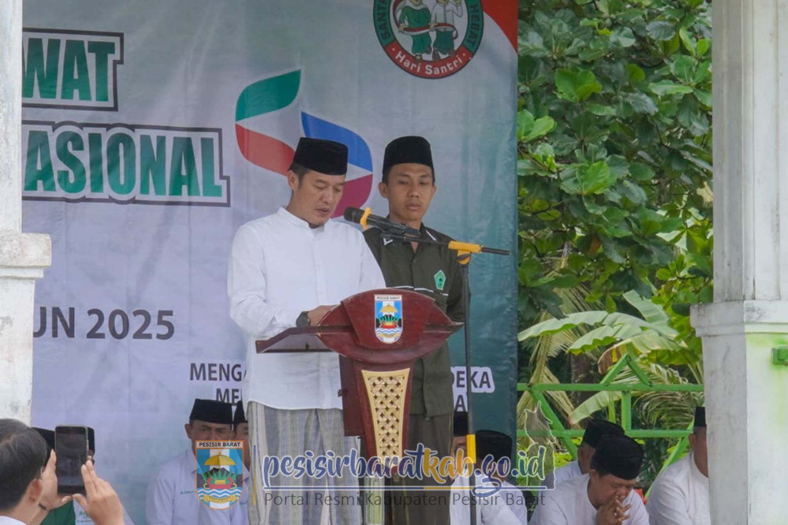 PESISIR BARAT-Bupati Pesisir Barat (Pesibar), Dedi Irawan menghadiri apel peringatan Hari Santri Nasional Tahun 2025, di Lapangan Merdeka Labuhan Jukung Kecamatan Pesisir Tengah, Rabu (22/10/2025).