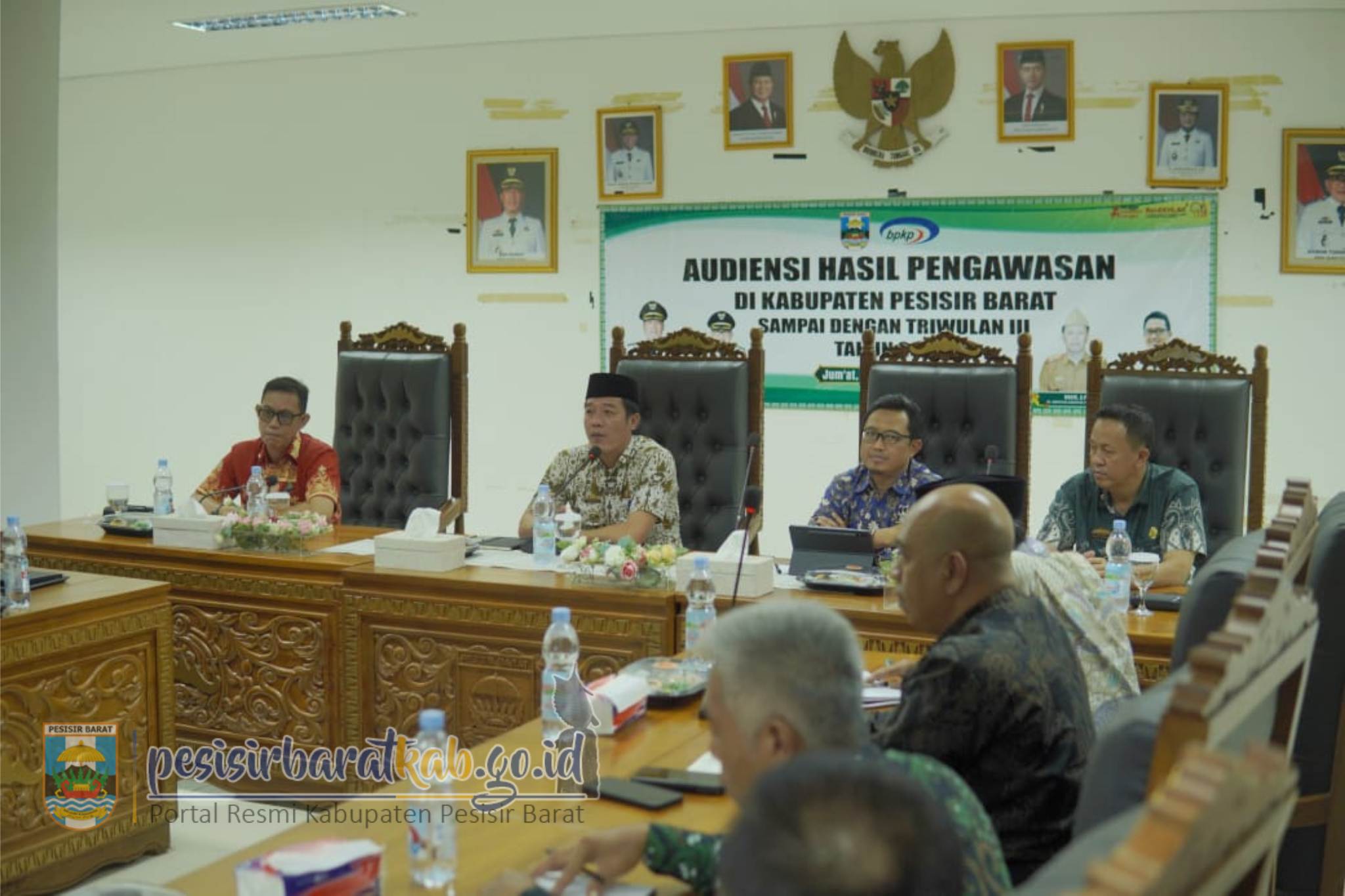 PESISIR BARAT-Bupati Pesisir Barat (Pesibar), Dedi Irawan menghadiri audiensi hasil pengawasan di Pesibar sampai dengan triwulan ke II oleh Perwakilan Badan Pemeriksa Keuangan dan Pembangunan (BPKP) Provinsi Lampung, di ruang Payung Agung Lantai 4 Komplek Perkantoran Pemkab Pesibar, Jumat (19/9/2025).