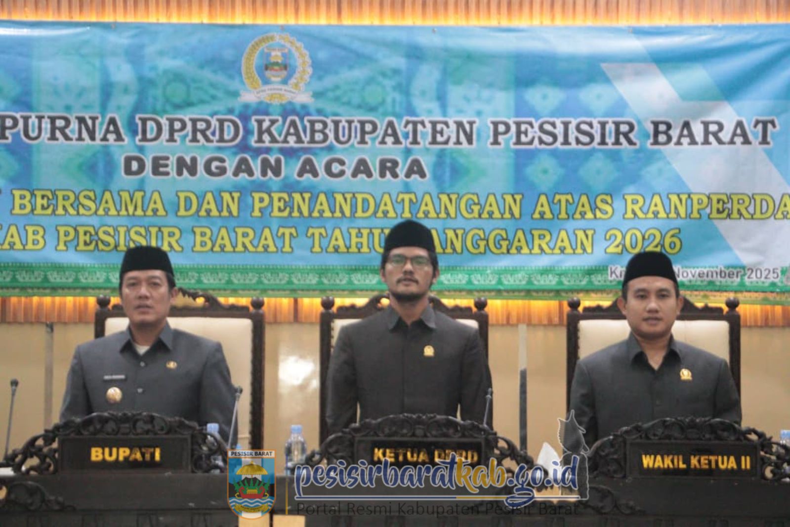 PESISIR BARAT-Bupati Pesisir Barat (Pesibar), Dedi Irawan, menghadiri rapat paripurna Dewan Perwakilan Rakyat Daerah (DPRD) dengan agenda Persetujuan Bersama Dan Penandatanganan Atas Rancangan Peraturan Daerah (Ranperda) APBD Kabupaten Pesisir Barat (Pesibar) Tahun Anggaran 2026, di ruang rapat paripurna DPRD Pesibar, Jumat (21/11/2025).