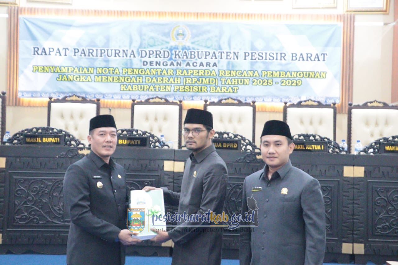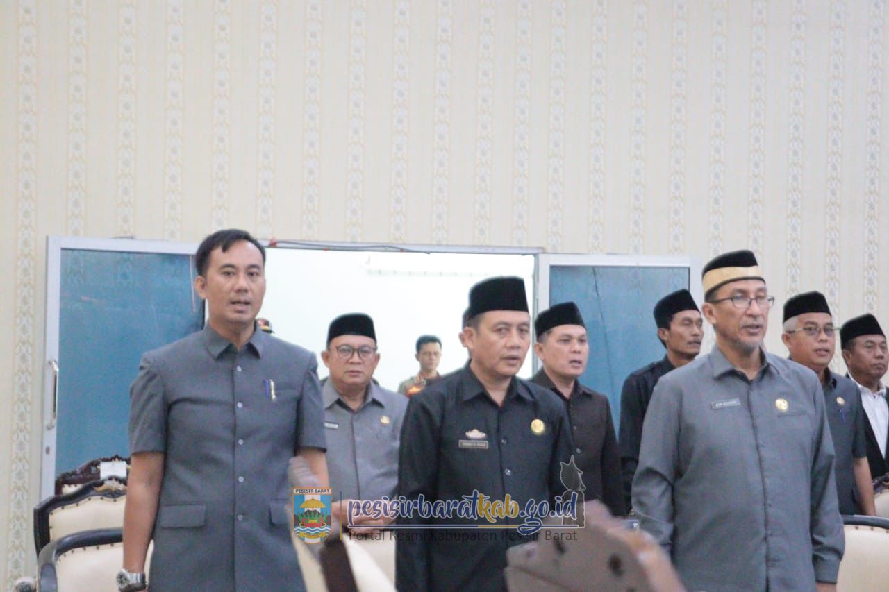 PESISIR BARAT-Bupati Pesisir Barat (Pesibar), Dedi Irawan, menghadiri rapat paripurna Dewan Perwakilan Rakyat Daerah (DPRD) dengan agenda Penyampaian Nota Keuangan Rancangan Peraturan Daerah (Ranperda) Pertanggungjawaban Pelaksanaan Anggaran Pendapatan dan Belanja Daerah (APBD) Pesibar Tahun 2024, di ruang rapat paripurna DPRD Pesibar, Selasa (8/7/2025).