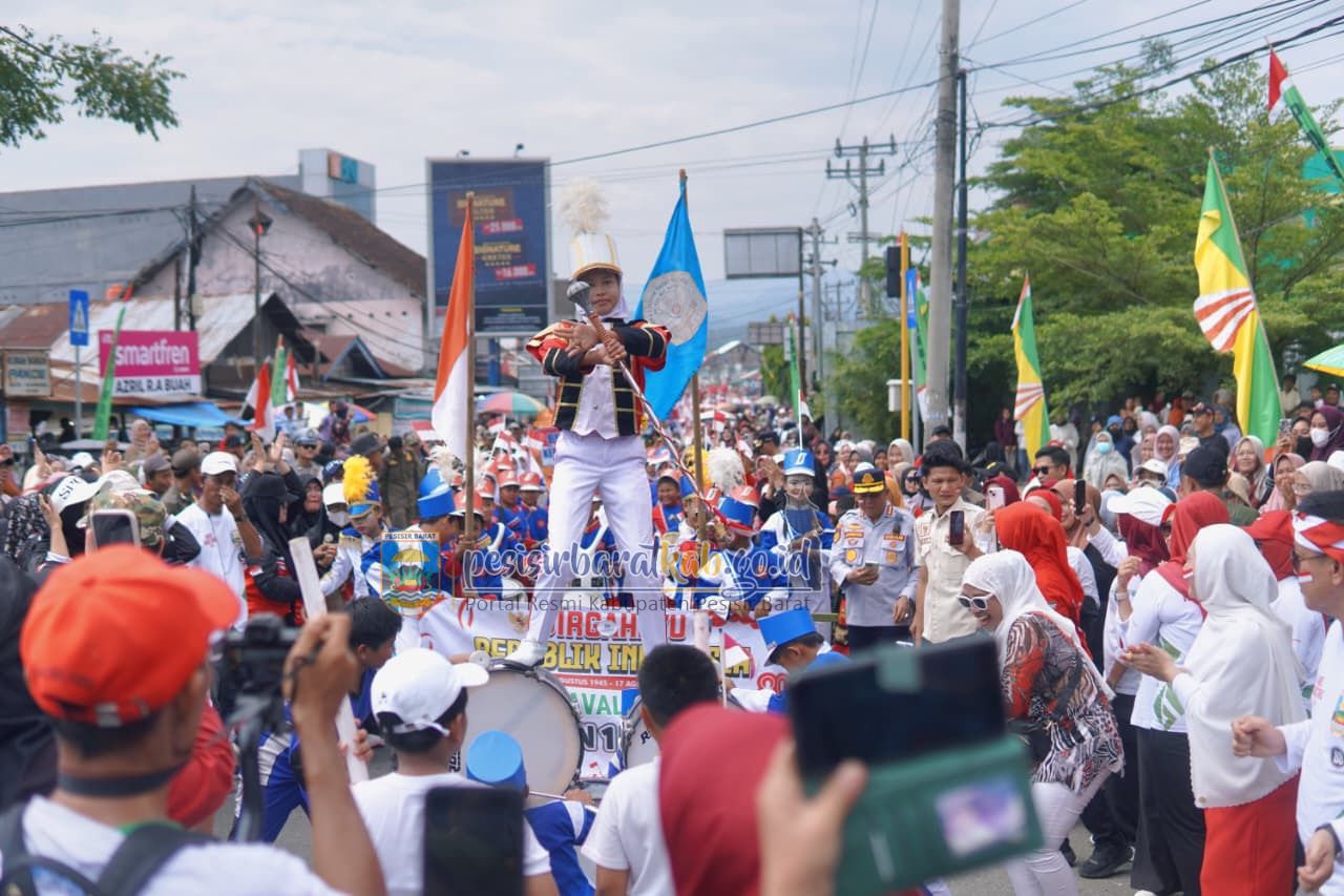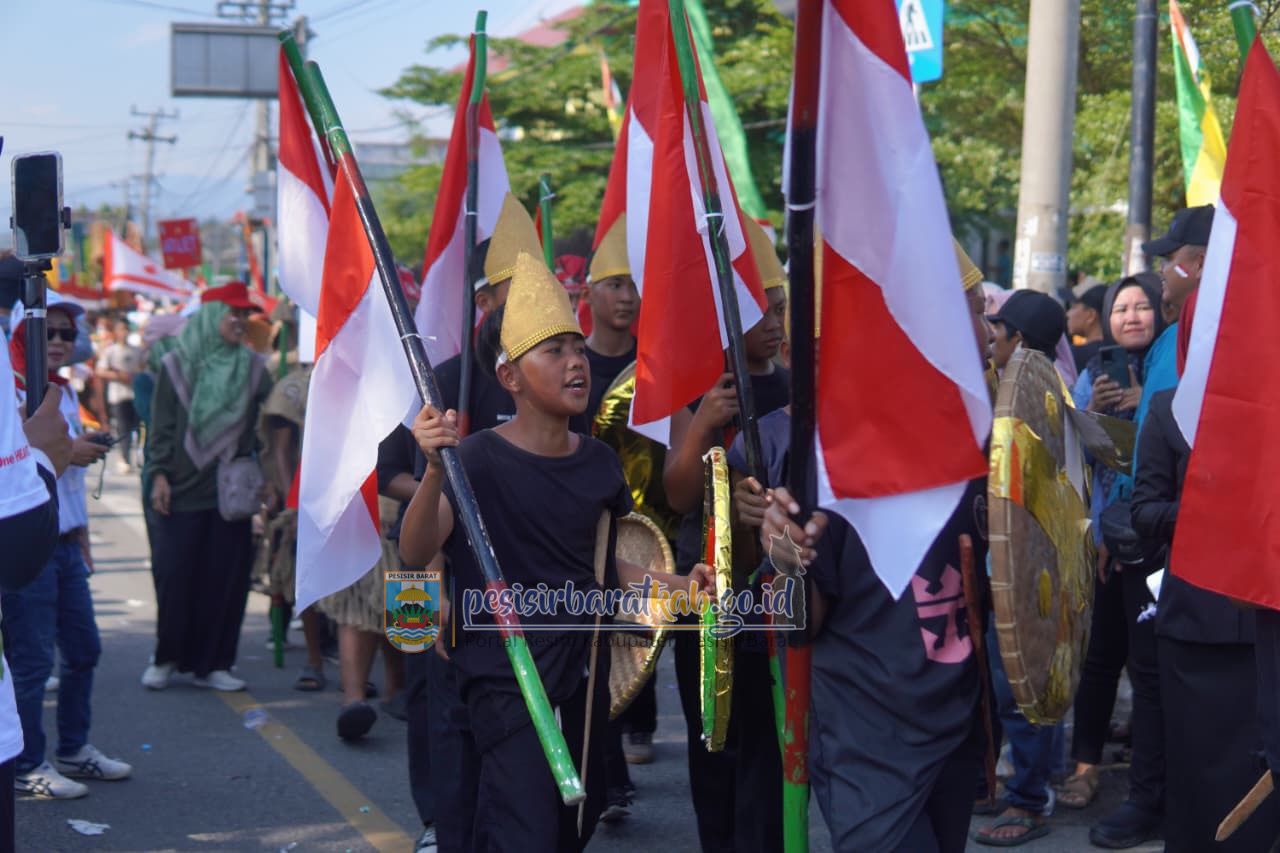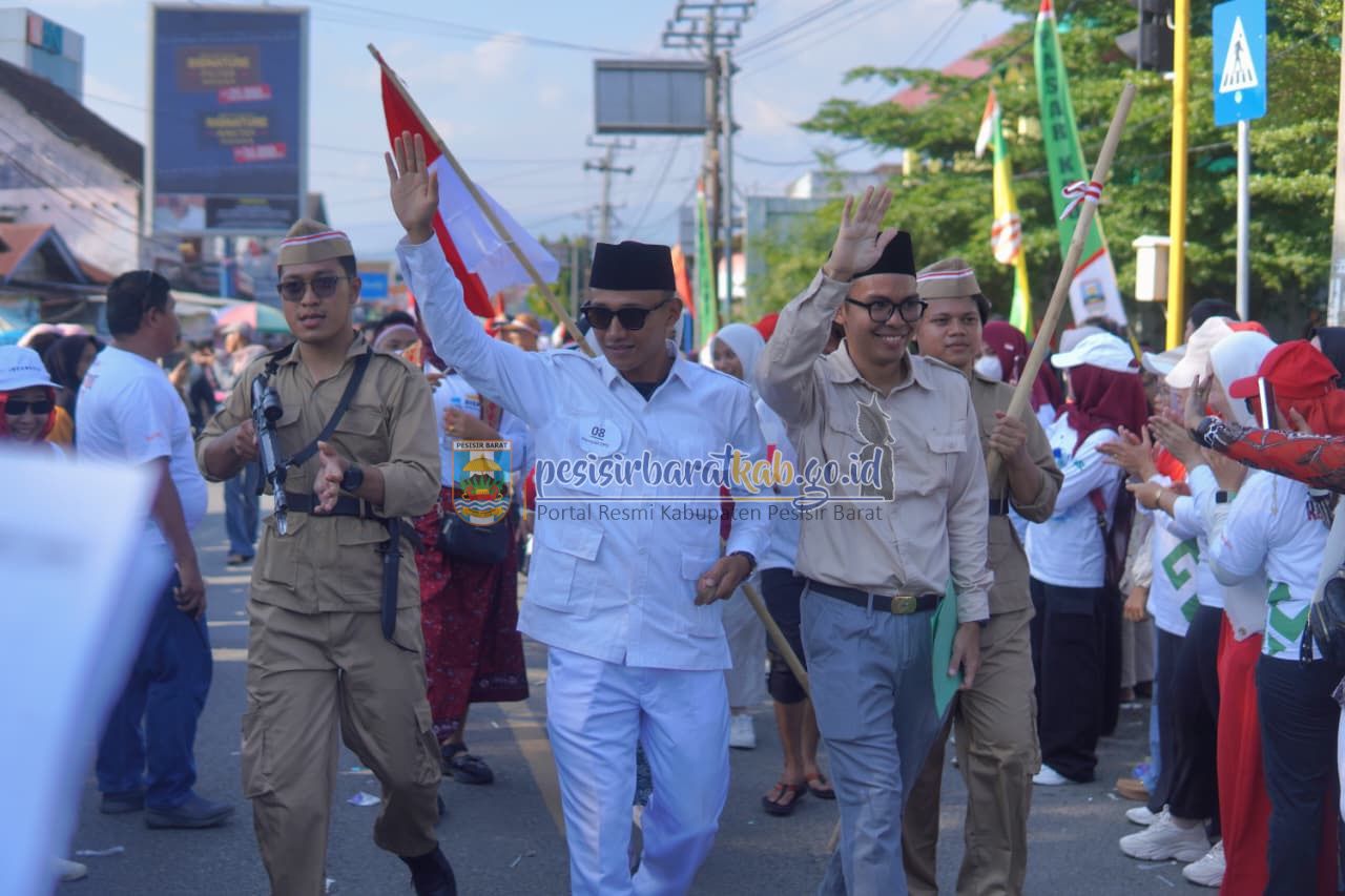 PESISIR BARAT-Bupati Pesisir Barat (Pesibar), Dedi Irawan melepas peserta karnaval budaya dalam rangka memperingati Hari Ulang Tahun (HUT) ke-80 Republik Indonesia (RI), Kecamatan Way Krui, Minggu (17/8/2025).