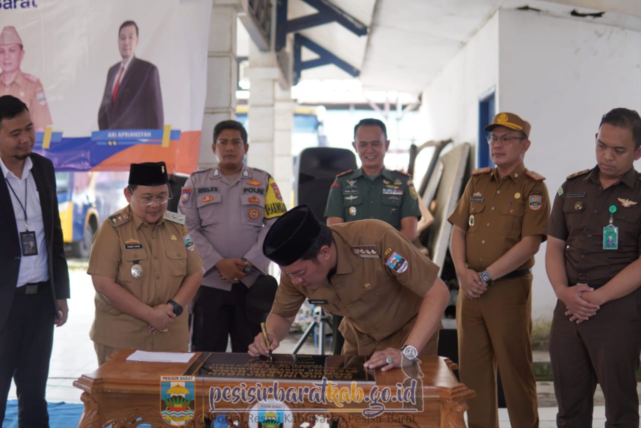 PESISIR BARAT-Bupati Pesisir Barat (Pesibar), Dedi Irawan meresmikan Gapura Pasar Way Batu Kecamatan Pesisir Tengah sekaligus serah terima tenda Usaha Mikro Kecil dan Menengah (UMKM), di Pasar Way Batu, Senin (23/6/2025).