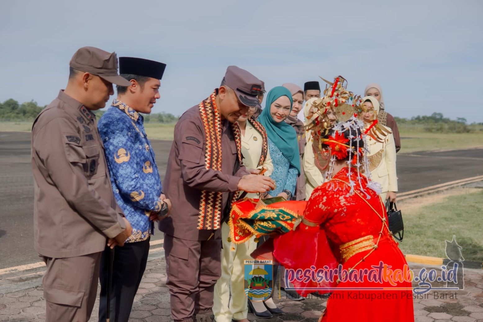 PESISIR BARAT-Pemerintah Kabupaten (Pemkab) Pesisir Barat (Pesibar) menyambut kunjungan kerja (Kunker) Kepala Kejaksaan Tinggi (Kejati) Provinsi Lampung, Dr. Danang Suryo Wibowo, S.H., LL.M., di Bandara Muhammad Taufiq Kiemas (MTK), Rabu (17/9/2025).