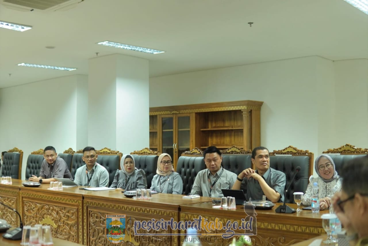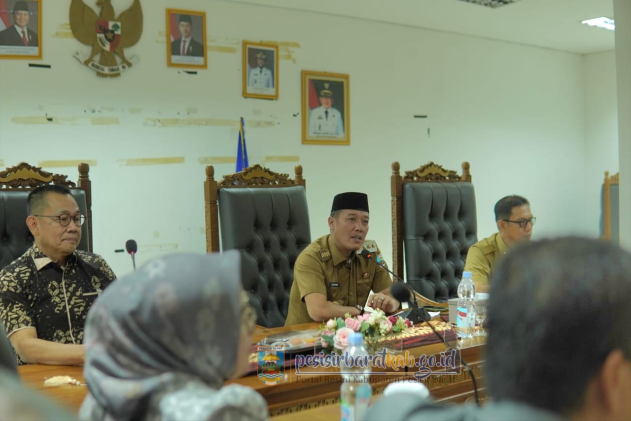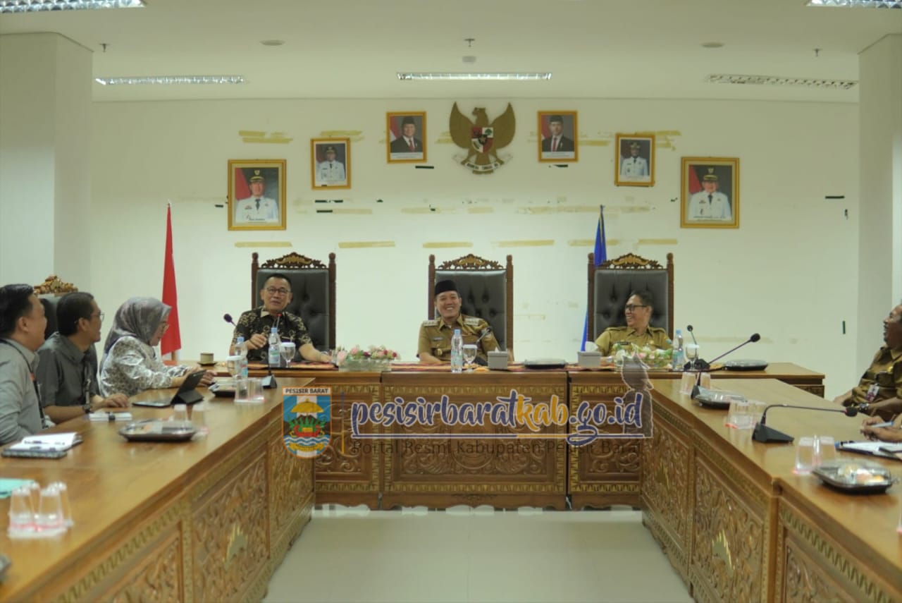 PESISIR BARAT-Bupati Pesisir Barat (Pesibar), Dedi Irawan, menyambut kunjungan Direktur Utama (Dirut) Bank Pembangunan Daerah (BPD) Lampung, di ruang rapat Bupati, Lantai 4 Gedung Marga Sai Batin Komplek Perkantoran Pemkab Pesibar, Selasa (15/7/2025).