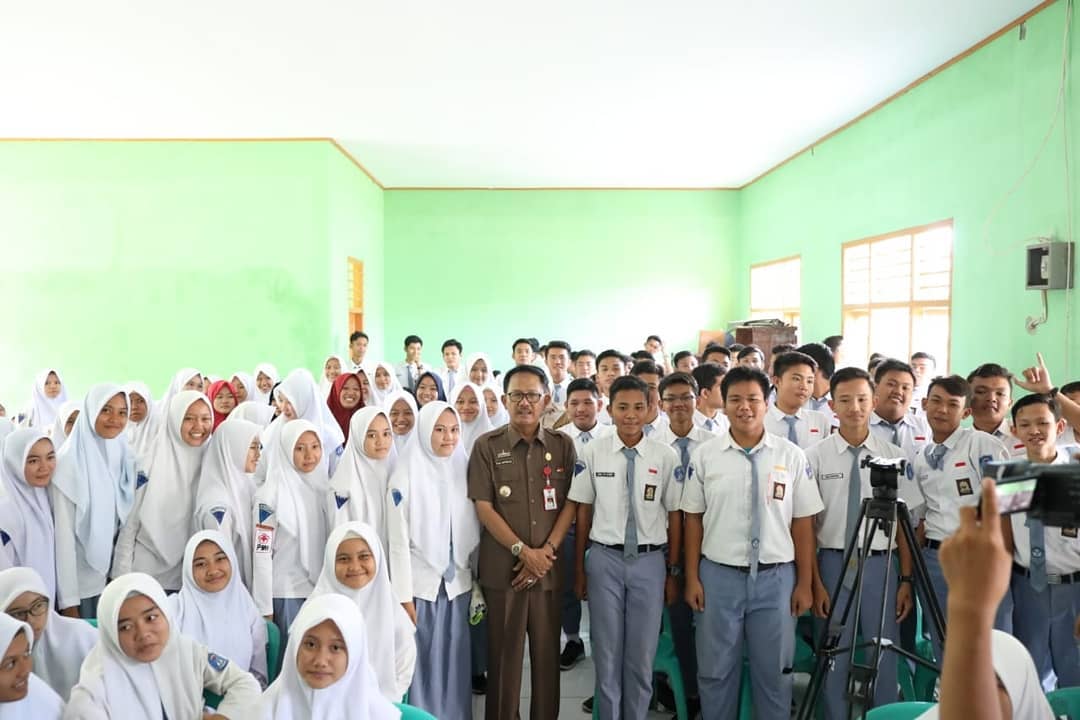 Bupati Pesisir Barat Dr.Drs. Agus Istiqlal, SH.,MH menyerahkan secara simbolis KTP-Elektronik kepada siswa dan siswi SMAN 1 Pesisir Tengah.