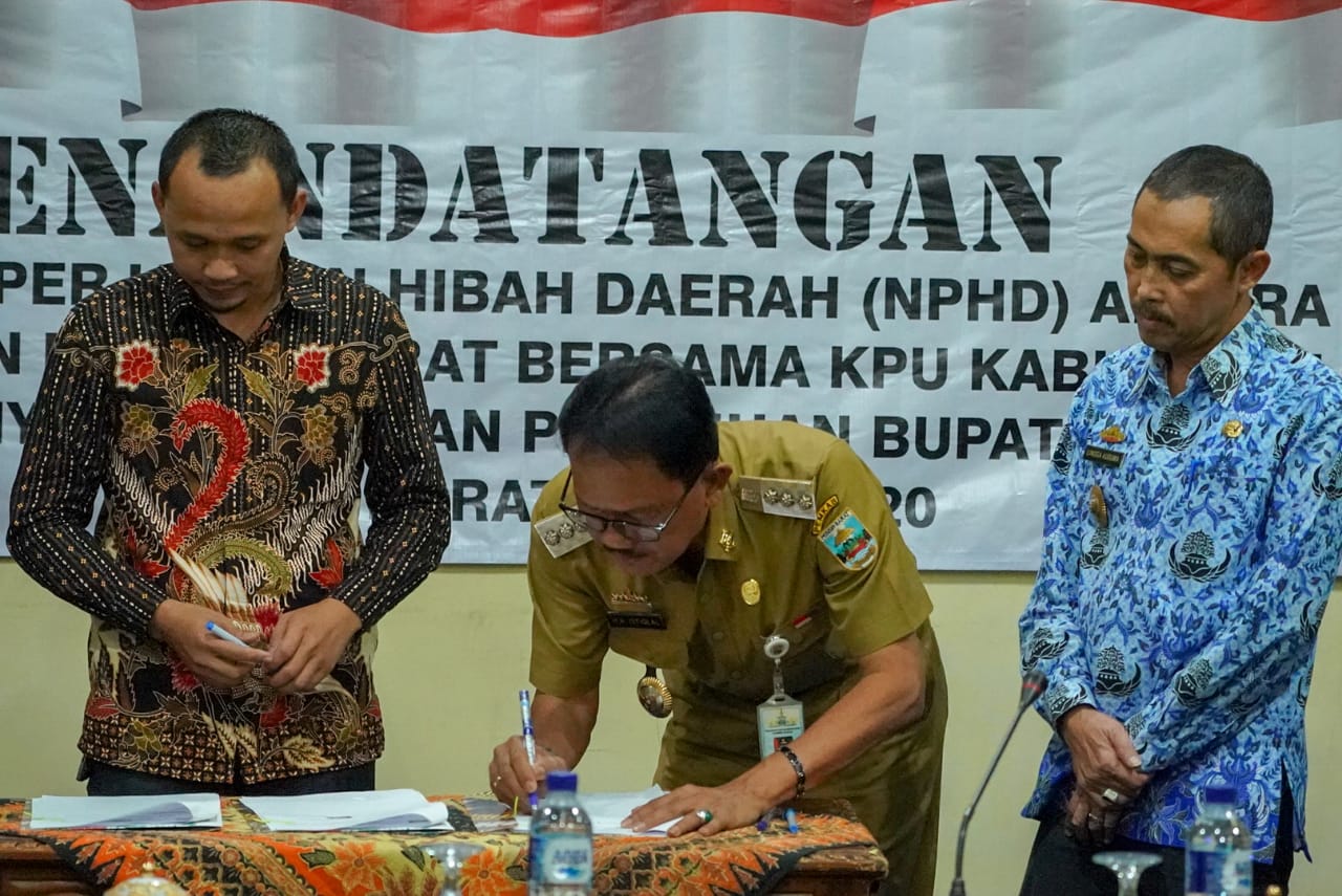 Bupati Pesisir Barat Dr. Drs. H. Agus Istiqlal, SH., M.H. didampingi oleh Pj. Sekda Pesisir Barat N. lingga Kusuma, MP. menandatangani Naskah Perjanjian Hibah Daerah (NPHD) antara Pemerintah Daerah Kabupaten Pesisir Barat bersama KPU Kabupaten Pesisir Barat dalam rangka Penyelenggaraan Pemilihan Bupati dan Wakil Bupati Kabupaten Pesisir Barat Tahun 2020 pada hari Selasa 1 Oktober 2019 bertempat di Operasional Room (OR) Cukuh Tangkil Sekretariat Daerah Kabupaten Pesisir Barat.