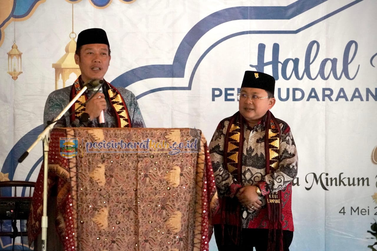 PESISIR BARAT-Kepala Dinas Komunikasi Informatika Statistik dan Persandian Kabupaten Pesisir Barat Suryadi, S.IP., M.M., menginformasikan bahwa, Bupati - Wakil Bupati Pesisir Barat (Pesibar), Dedi Irawan - Irawan Topani, S.H., M.Kn., menghadiri Halal Bihalal Persaudaraan Masyarakat Pesisir Barat Krui Lampung (PMPBKL), di Telaga Purnama Nasi Pong-Pong, BRIN, Lingkar Luar Jalan Sari Mulya Kota Tanggerang, Minggu (4/5/2025).