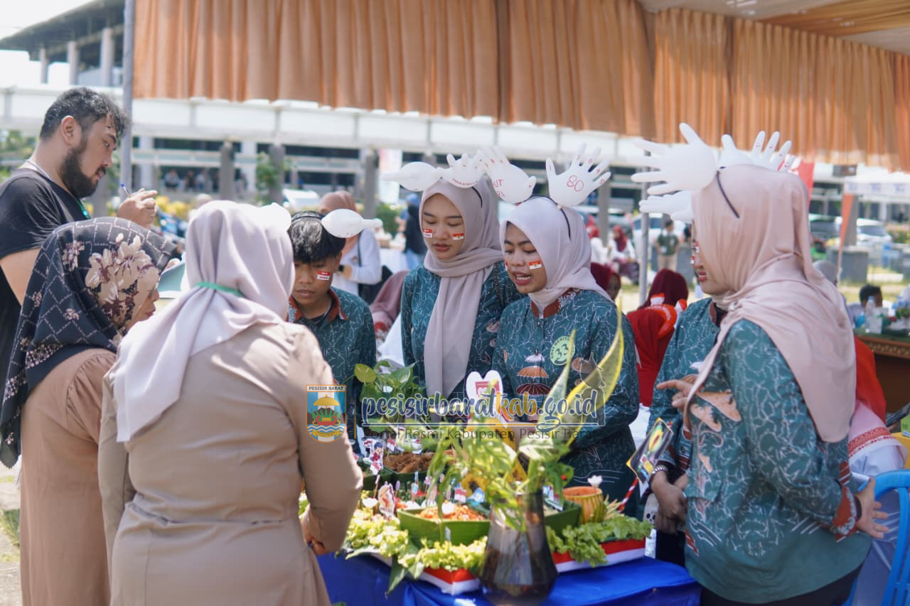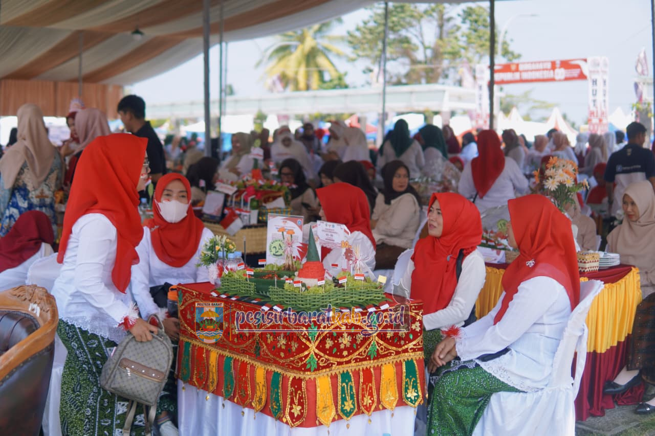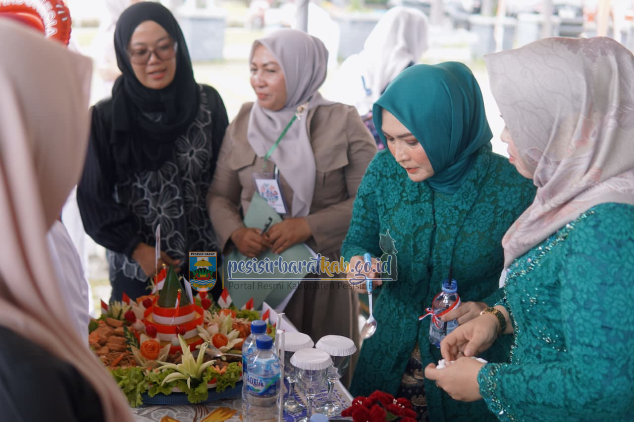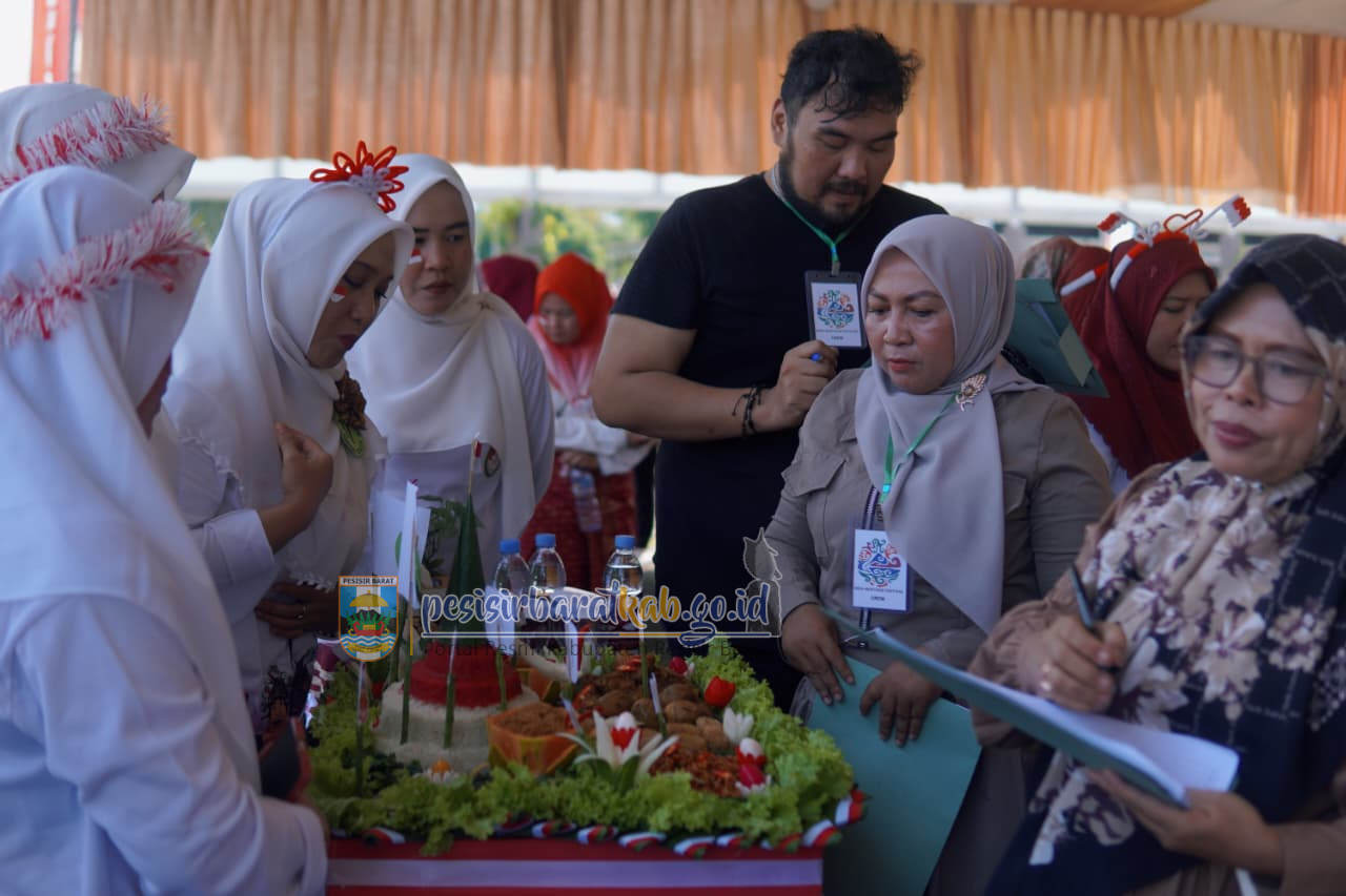 PESISIR BARAT-Ketua dan Ketua 1 Tim Penggerak-Pemberdayaan Kesejahteraan Keluarga (TP-PKK) Kabupaten Pesisir Barat (Pesibar), Dian Hardiyanti Dedi, S.ST., M.M., dan Dea Derika Topani, S.H., M.Kn., didaulat menjadi dewan juri pada Lomba Tumpeng dalam perhelatan Krui Heritage Festival Tahun 2025, di Lapangan Komplek Perkantoran Pemkab Pesibar, Jumat (15/8/2025).