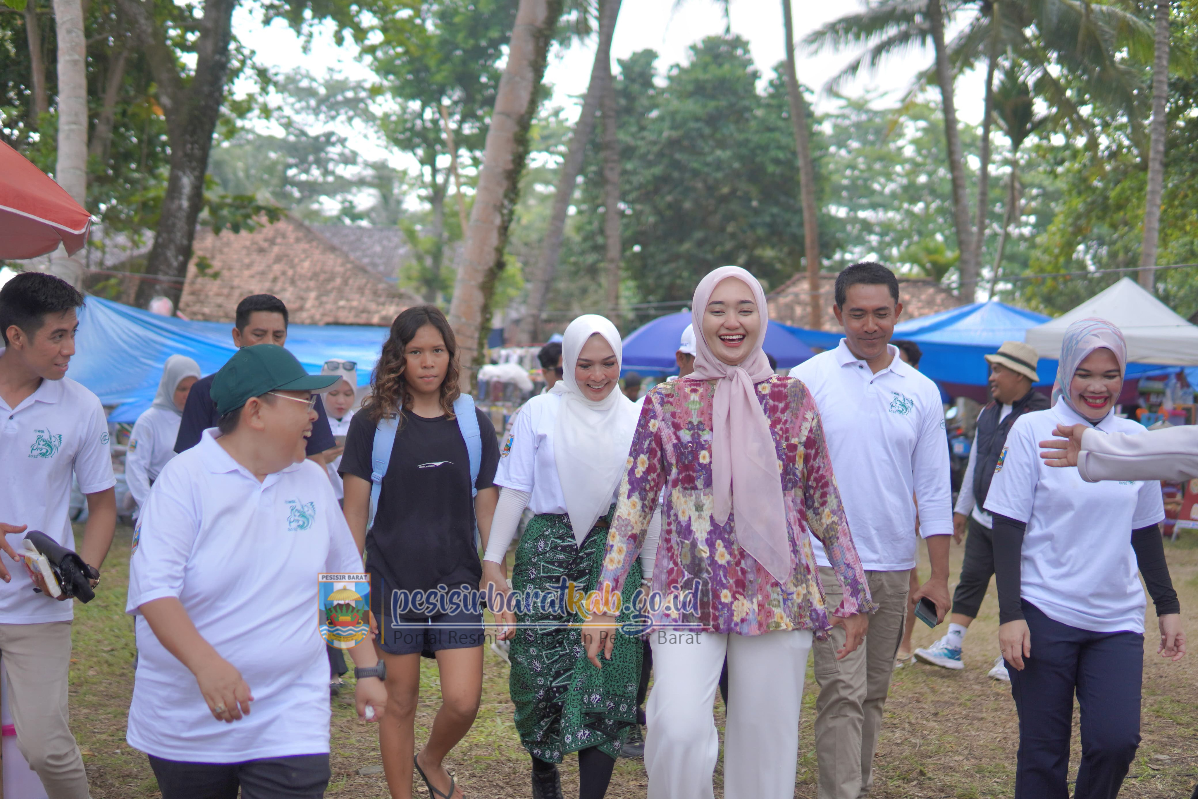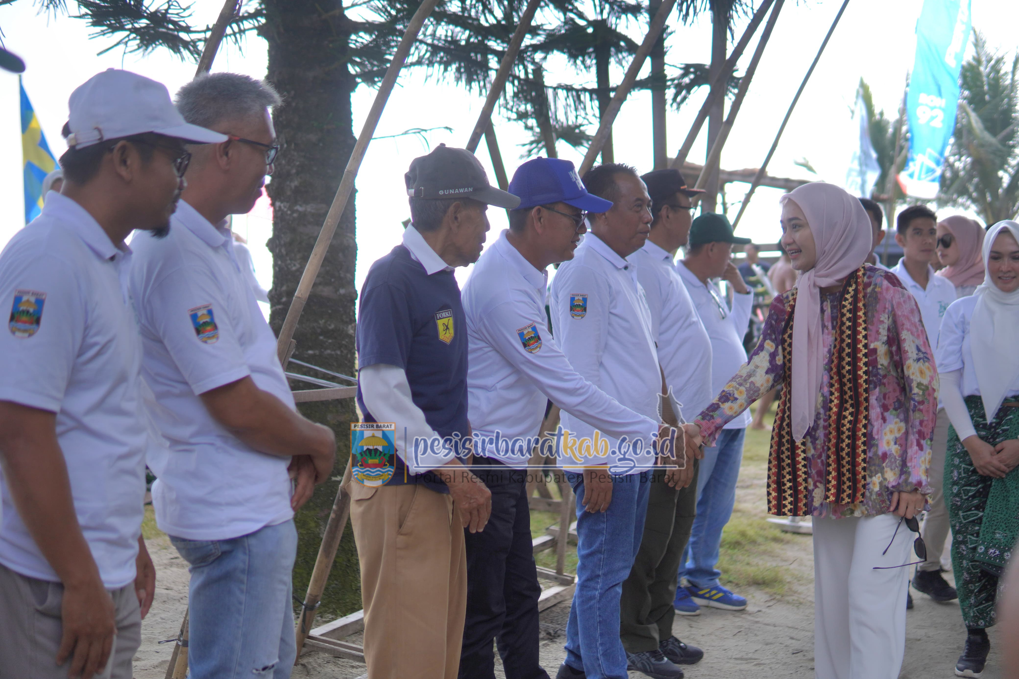 PESISIR BARAT-Wakil Bupati Pesisir Barat (Pesibar), Irawan Topani, S.H., M.Kn., menyambut kedatangan Wakil Gubernur Lampung, dr. Jihan Nurlela, M.M., dalam rangka peninjauan gelaran World Surf League (WSL) Krui Pro Qualifying Series (QS) Tahun 2025 di Pantai Karang Nyimbor Pekon Tanjung Setia Kecamatan Pesisir Selatan, Sabtu (14/6/2025).