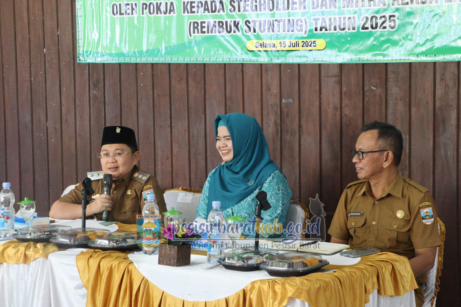PESISIR BARAT-Wakil Bupati Pesisir Barat (Pesibar), Irawan Topani, S.H., M.Kn., sekaligus Ketua Tim Percepatan Penurunan Stunting (TPPS) Pesibar, menghadiri sekaligus membuka kegiatan advokasi Program Bangga Kencana oleh pokja kepada stake holder dan mitra kerja lainnya (Rembuk Stunting) Tahun 2025, di Aula Sunset Beach Pekon Way Redak Kecamatan Pesisir Tengah, Selasa (15/7/2025).