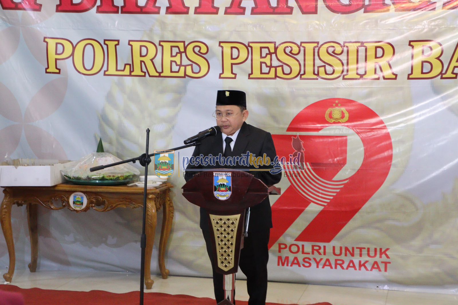 PESISIR BARAT-Wakil Bupati Pesisir Barat (Pesibar), Irawan Topani, S.H., M.Kn., menghadiri kegiatan syukuran peringatan Hari Bhayangkara ke-79, di Lobi Lantai 1 Gedung Marga Sai Batin Komplek Perkantoran Pemkab Pesibar, Selasa (1/7/2025).