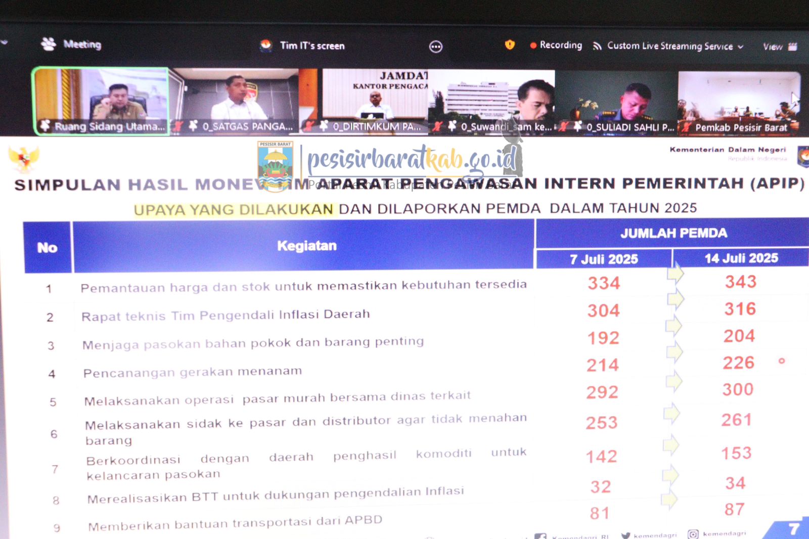 PESISIR BARAT-Asisten II Bidang Perekonomian dan Pembangunan Sekretariat Pemerintah Kabupaten (Pemkab) Pesisir Barat (Pesibar), Drs. Zukri Amin, M.P., mengikuti Rapat Koordinasi Pengendalian Inflasi yang dirangkaikan dengan Pembahasan Evaluasi Dukungan Pemerintah Daerah terhadap Program Nasional 3 Juta Rumah, melalui virtual melalui Zoom Meeting, Senin (14/7/2025).