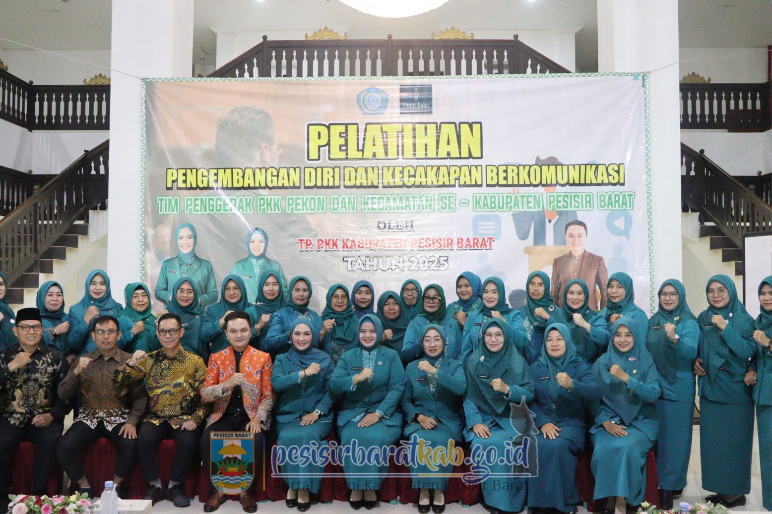 PESISIR BARAT-Ketua Tim Penggerak-Pemberdayaan Kesejahteraan Keluarga (TP-PKK) Kabupaten Pesisir Barat (Pesibar), Dian Hardiyanti Dedi, S.ST., M.M., membuka kegiatan Pelatihan Public Speaking Tahun 2025, di Loby Lantai 1 Gedung Marga Sai Batin Komplek Perkantoran Pemkab Pesibar, Sabtu (4/10/2025).