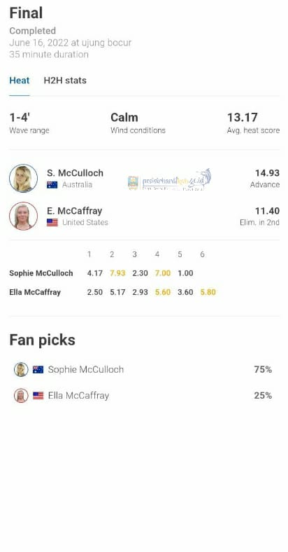 Pada pertandingan final di kelas WQS5000 sebanyak 1 heat yang berlangsung selama 35 menit, atlet selancar wanita yang berasal dari Australia bernama Sophie McCulloch berhasil mendapatkan juara 1 dengan perolehan nilai 14.93 (7.93+7.00) mengalahkan atlet selancar wanita yang berasal dari Amerika Serikat bernama Ella McCaffray yang mendapatkan nilai 11.40 (5.60+5.80)