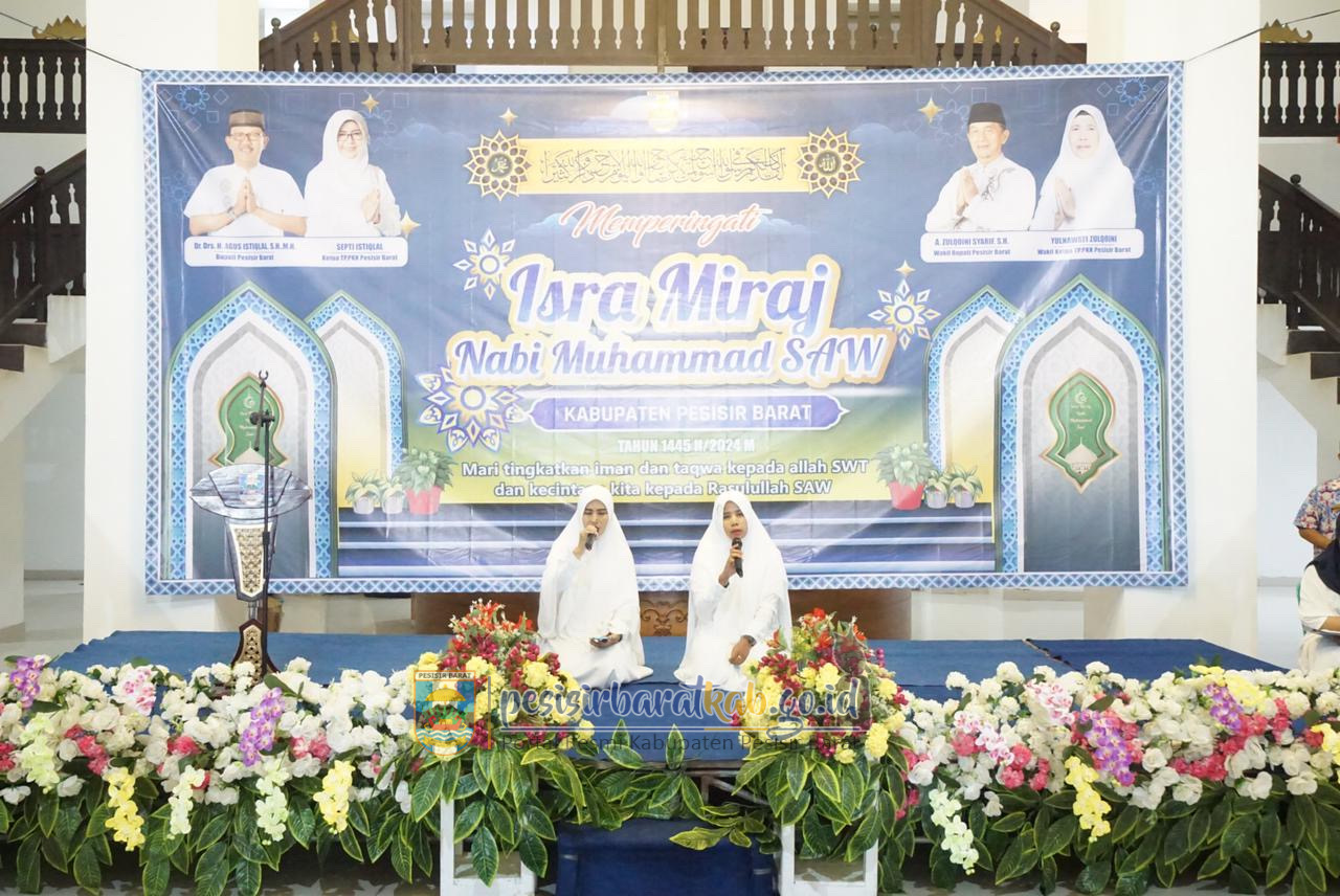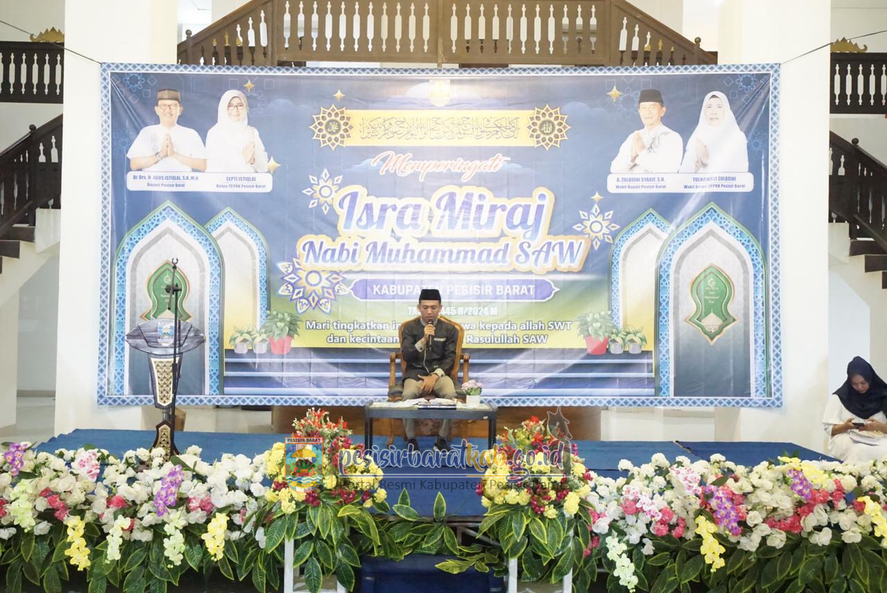 PESISIR BARAT-Kepala Dinas Komunikasi, Informatika, Statistik, dan Persandian (Diskominfotiksan), Suryadi, S.IP., M.M., menginformasikan bahwa, Pemerintah Kabupaten (Pemkab) Pesisir Barat (Pesibar) menggelar peringatan Isra Mi'raj Nabi Muhammad SAW 1445 Hijriah Tahun 2024, di Lobi Utama Lantai 1 Gedung A Komplek Perkantoran Pemkab Pesibar, Jumat (23/2/2024).