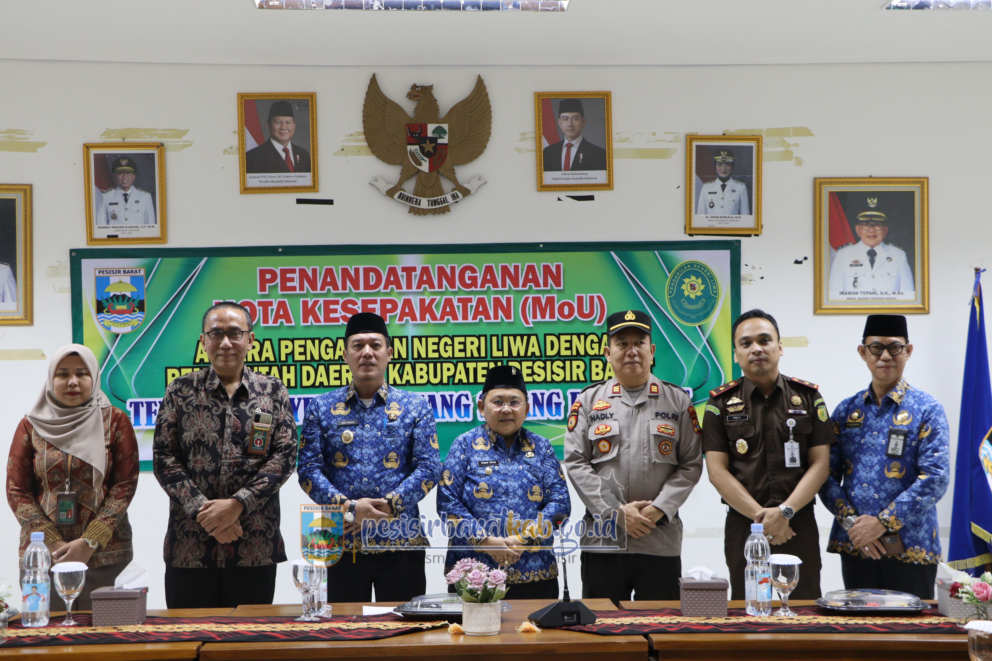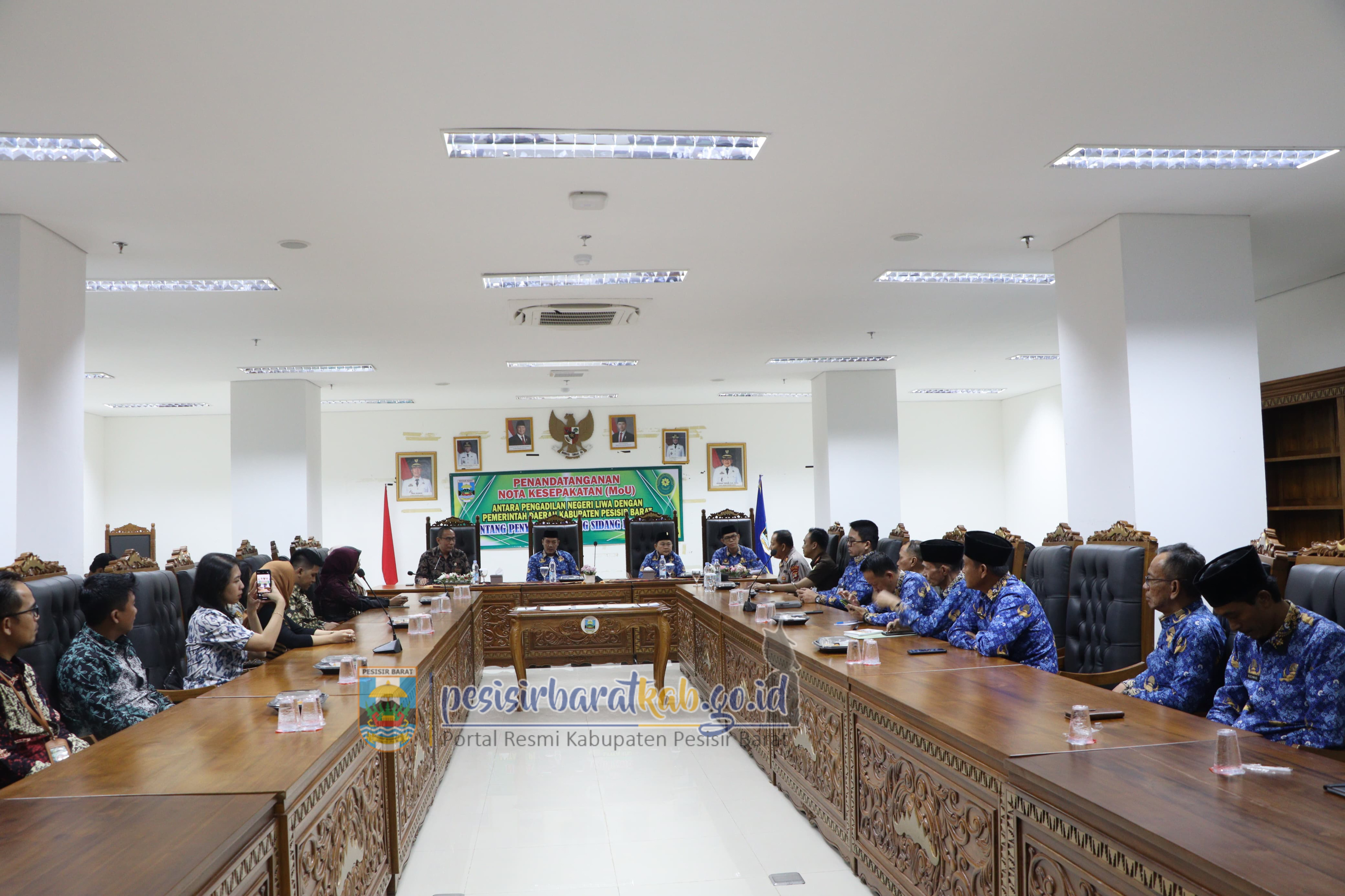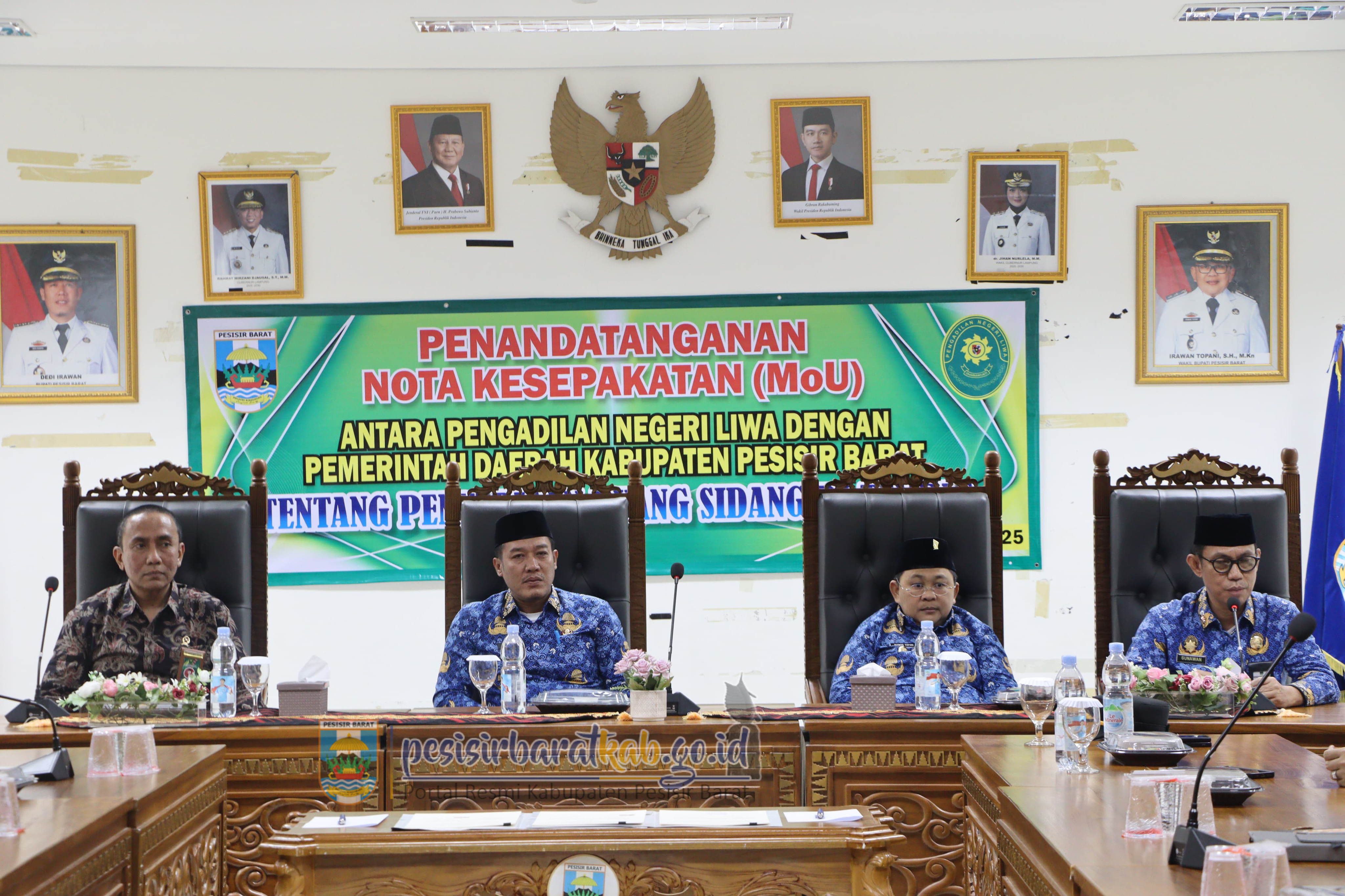 PESISIR BARAT-Pemerintah Kabupaten (Pemkab) Pesisir Barat (Pesibar) menggelar penandatanganan Memorandum of Understanding (MoU) dengan Pengadilan Negeri (PN) Liwa tentang penyediaan ruang sidang di tempat, di ruang rapat Bupati, Lantai 4 Gedung Marga Sai Batin Komplek Perkantoran Pemkab Pesibar, Kamis (17/7/2025).