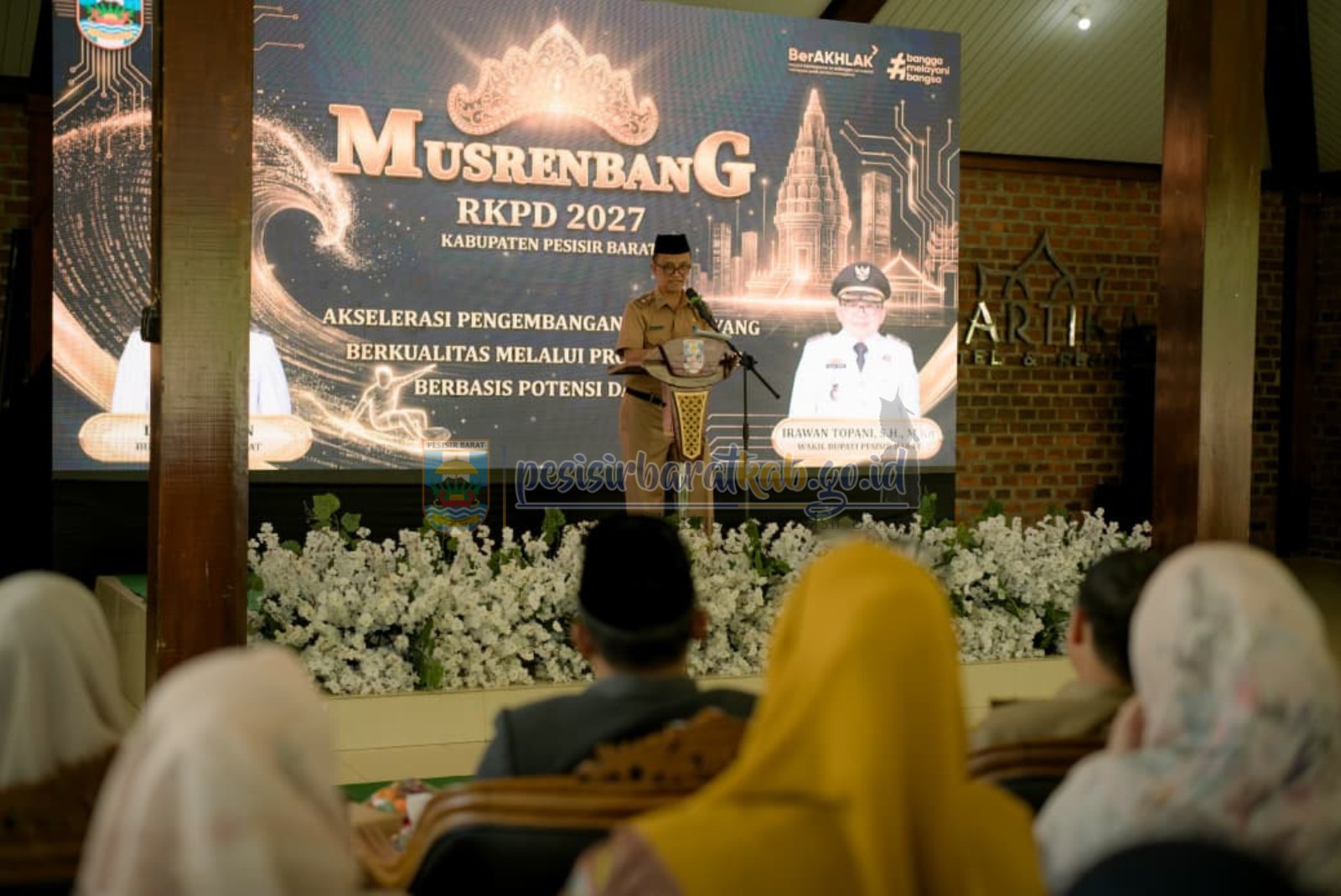 PESISIR BARAT – Pemerintah Kabupaten (Pemkab) Pesisir Barat (Pesibar) menggelar Musyawarah Perencanaan Pembangunan (Musrenbang) dalam rangka penyusunan Rencana Kerja Pemerintah Daerah (RKPD) Tahun 2027. Kegiatan ini menjadi momentum strategis untuk menyelaraskan arah pembangunan daerah dengan prioritas Pemerintah Provinsi Lampung dan Pemerintah Pusat. Bertempat di Aula hotel Sartika pekon seray, Senin 30 maret 2026.