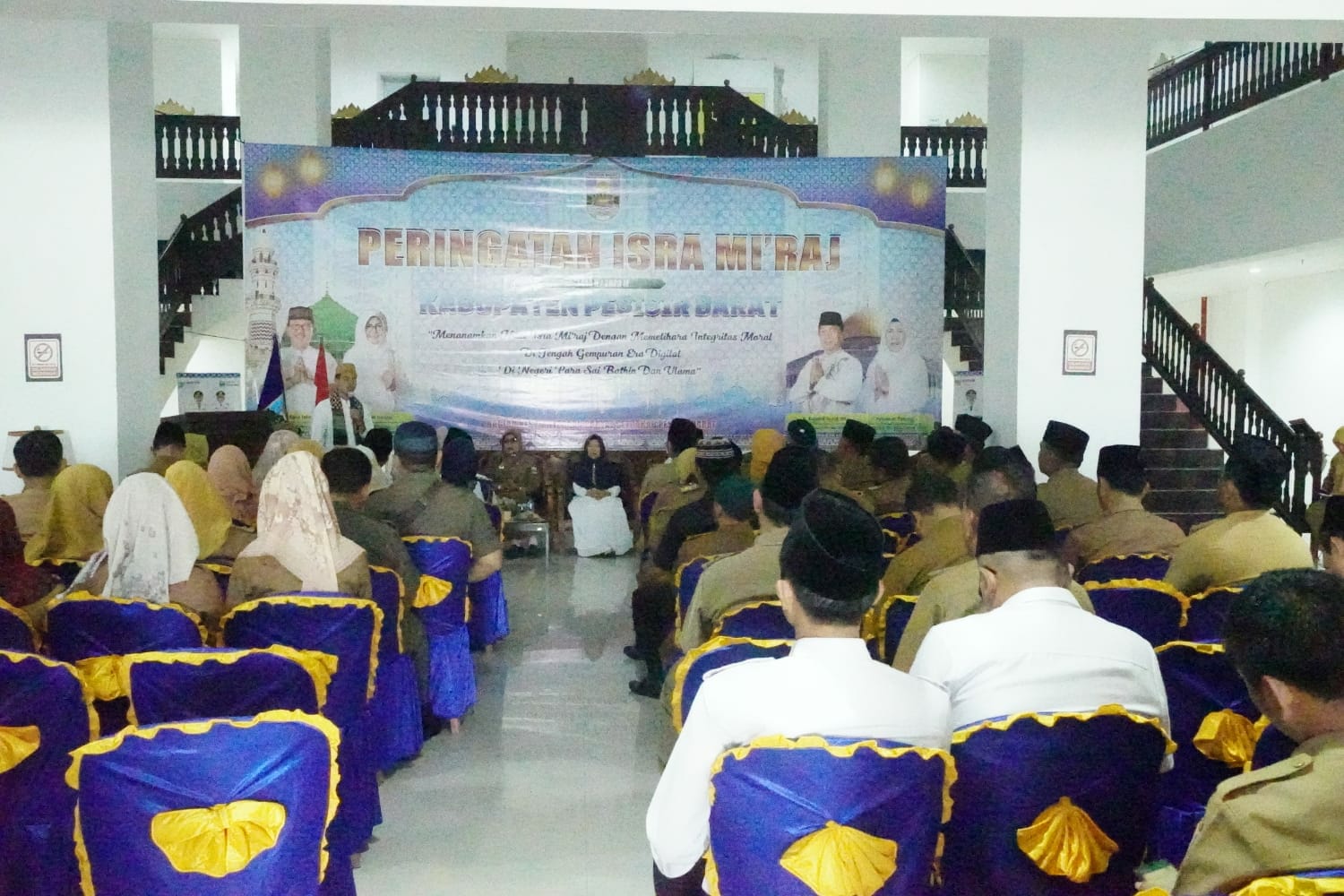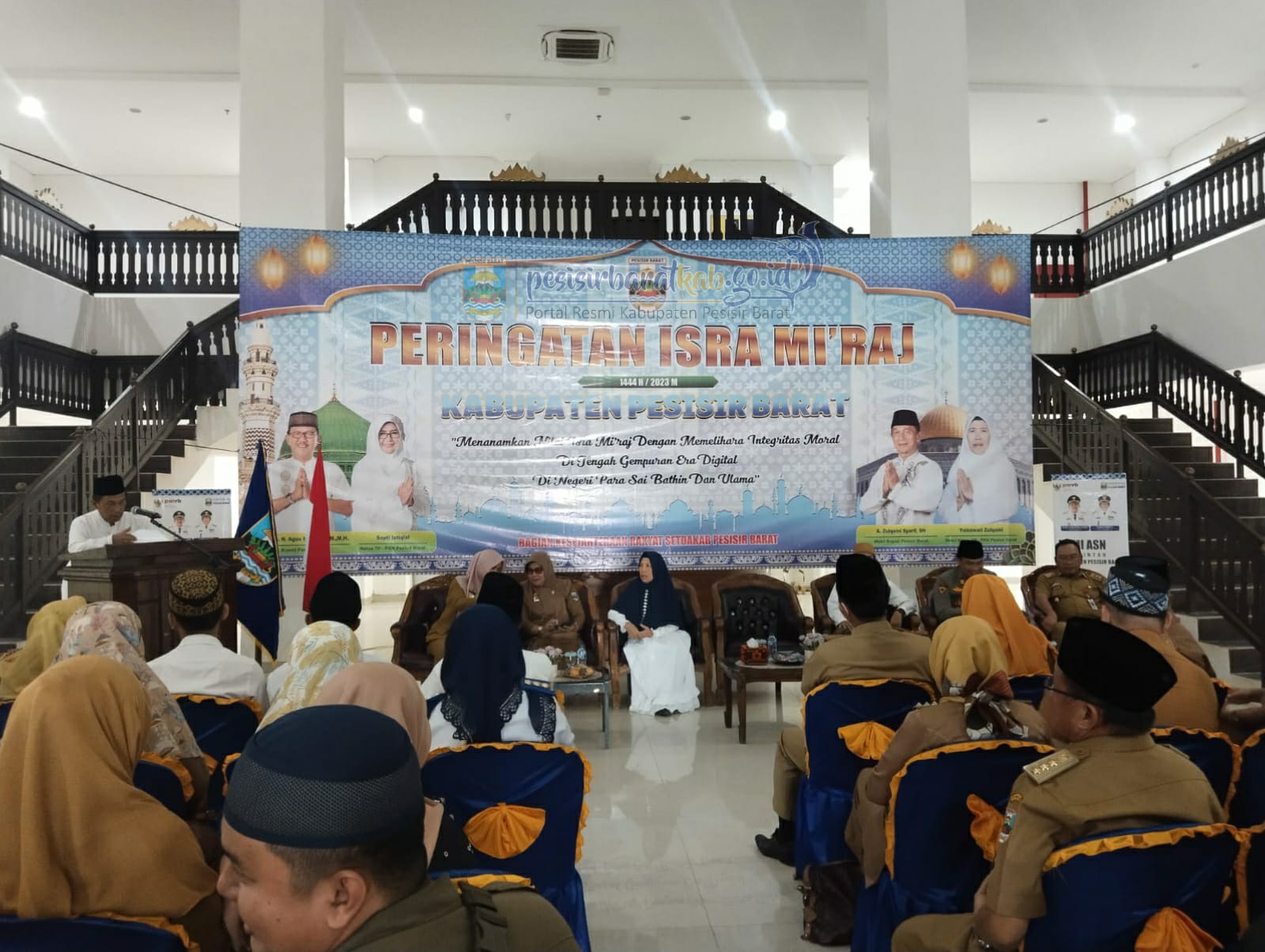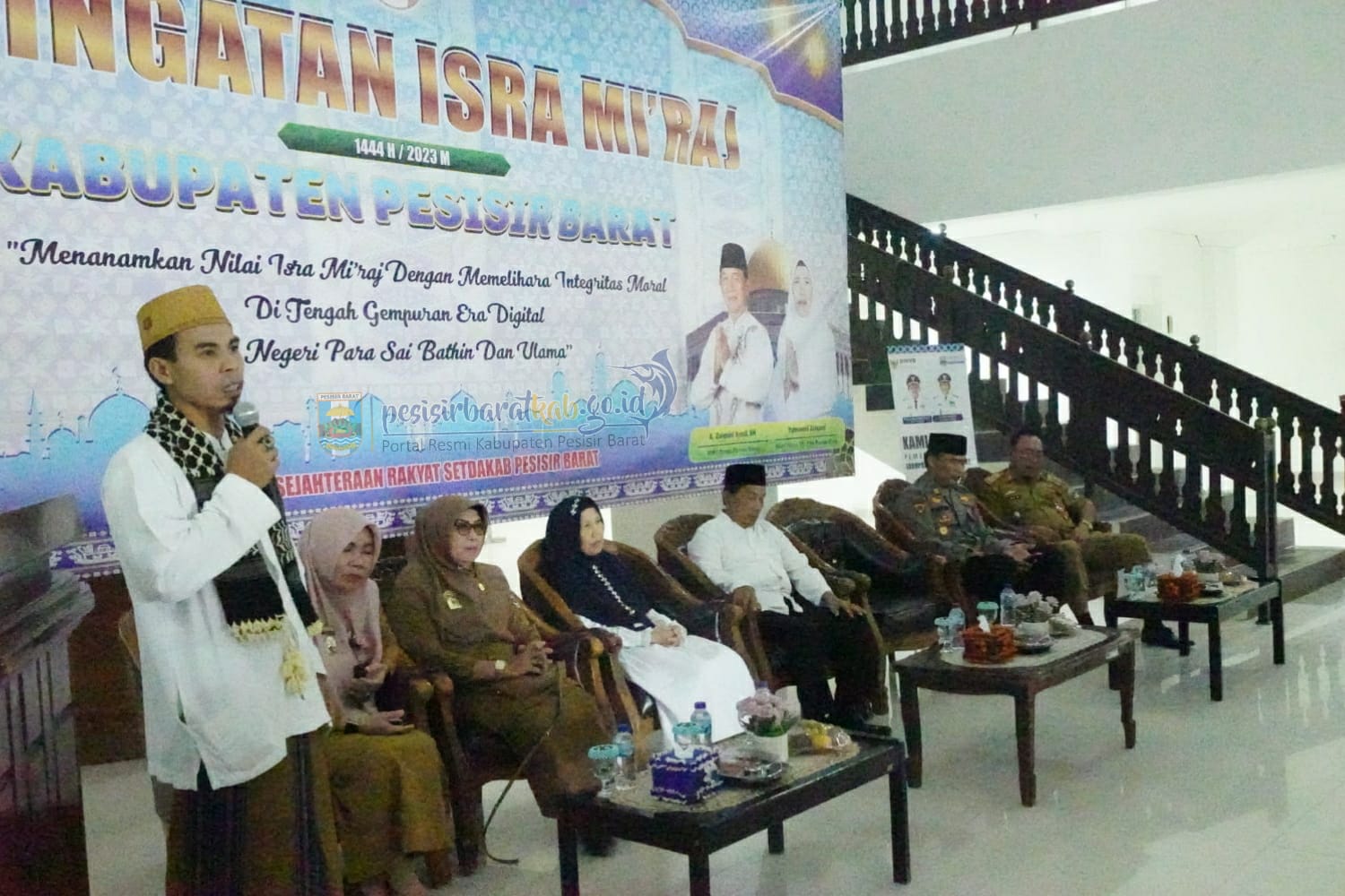 Peringatan Isra Mi'raj Pemkab Pesisir Barat mengakat tema" " Menanamkan Nilai Isra Mi'raj Dengan Memelihara Integritas Moral Di Tengah Gempuran Era Digital Di Negeri Para Sai Batin Dan Ulama" dan juga diisi oleh Penceramah Ustad Bahirman Hamka.