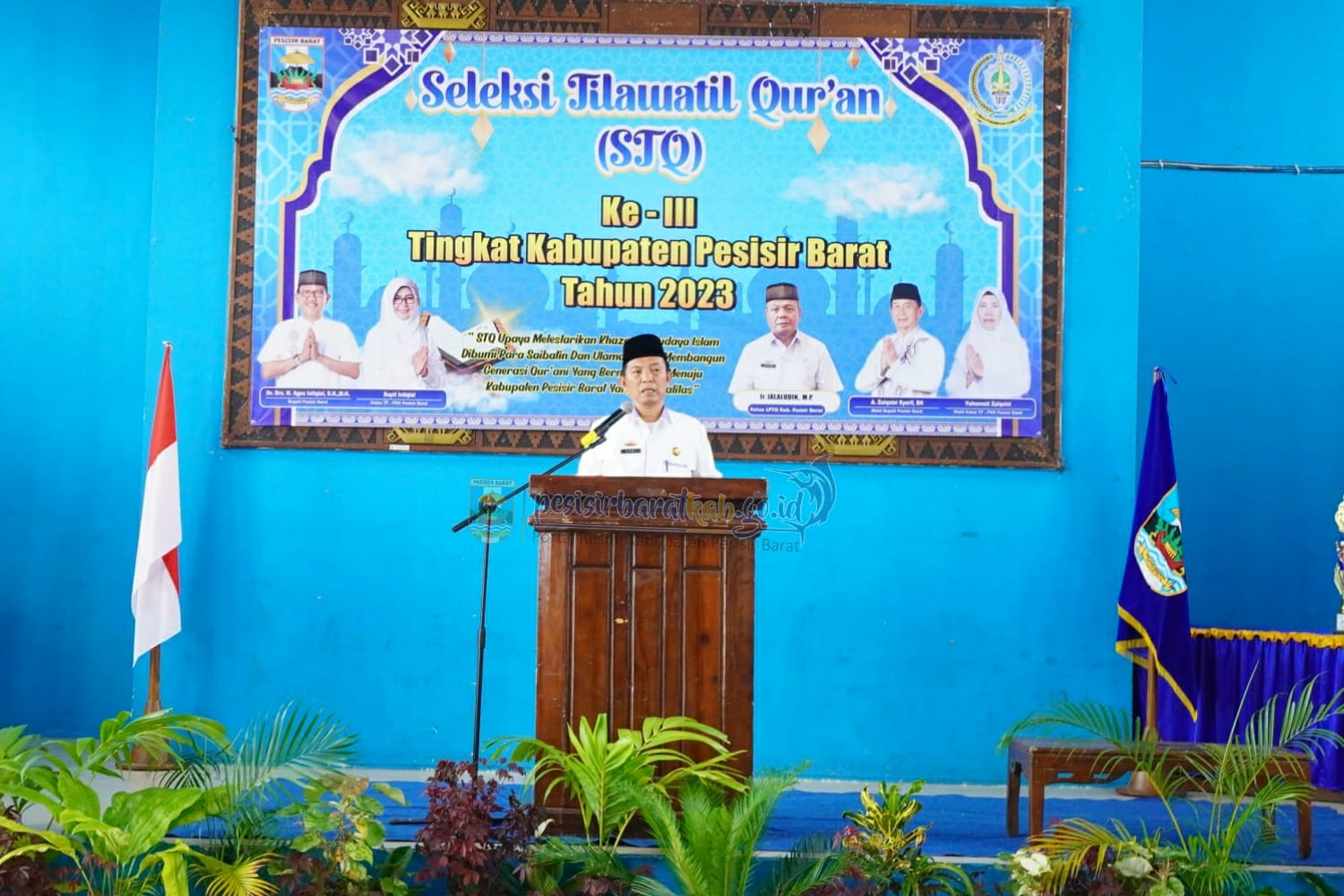 Kadis Kominfotiksan Kabupaten Pesisir Barat, Suryadi, S.IP., M.M. menginformasikan bahwa Bupati Pesisir Barat, Dr. Drs. Agus Istiqlal, S.H., M.H. yang dalam hal ini diwakili oleh Wakil Bupati Prsisir Barat, A. Zulqoini Syarif, S.H. menutup secara resmi kegiatan Seleksi Tilawatil Qur'an (STQ) ke-III Tingkat Kabupaten Pesisir Barat Tahun 2023 dengan tema" STQ Upaya Melestarikan Khazanah Budaya Islam di Bumi Para Sai Batin dan Ulama dalam Membangun Generasi Qur'anni yang Bermartabat Menuju Kabupaten Pesisir Barat yang Berkualitas". Kegiatan ini telah dilaksanakan selama 3 hari, yaitu pada tanggal 6 Marer 2023-8 Maret 2023 bertempat di Gedung Serbaguna Guna (GSG) Selalaw Labuhan Jukung Kec. Pesisir Tengah.