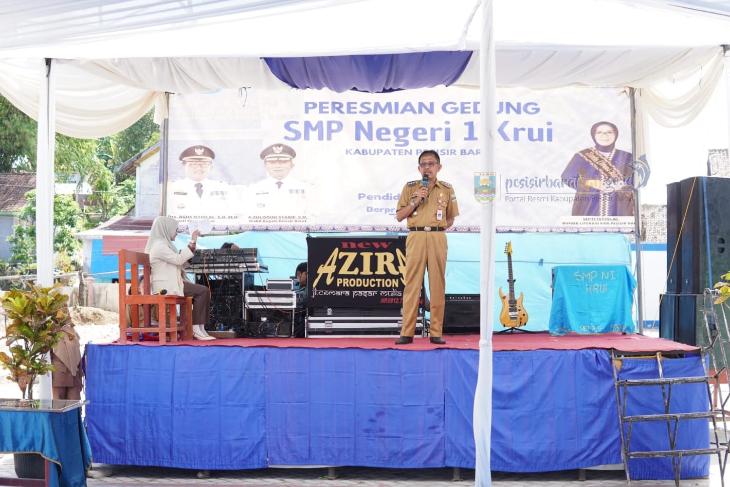 Kadis Kominfotik dan Persandian Pesisir Barat Suryadi, S.IP., MM. menginformasikan bahwa gedung Sekolah Menengah Pertama (SMP) Negeri 1 Krui yang bertempat Kecamatan Pesisir Tengah diresmikan secara langsung oleh Bupati Pesisir Barat Dr. Drs. Agus Istiqlal. Peresmian ditandai dengan penandatanganan prasasti dan pemotongan pita serta dilanjutkan pembagian alat tulis kepada Siswa/Siswi SMP Negeri 1 Krui.