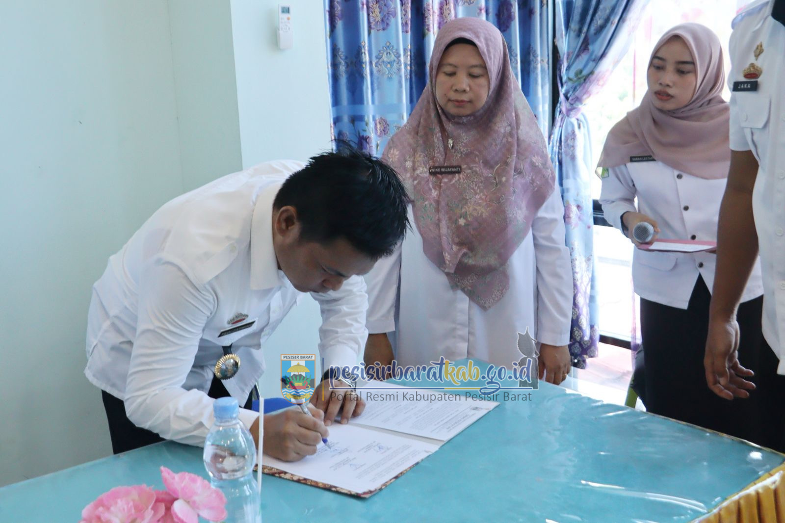 PESISIR BARAT-Kepala Dinas Komunikasi Informatika Statistik dan Persandian Kabupaten Pesisir Barat Suryadi, S.IP., M.M., menginformasikan bahwa, Pj. Sekda Kabupaten Pesisir Barat (Pesibar), Tedi Zadmiko, S.KM., S.H., M.M., menghadiri Serah Terima Jabatan (Sertijab) Kepala Dinas Kesehatan (Dinkes) lama, Wike Wijayanti, S.ST., M.M, ke Plt. Kepala Dinkes baru, Septono, S.KM., M.M, di Aula Kantor Puskesmas Krui Kecamatan Pesisir Tengah, Rabu (16/4/2025).