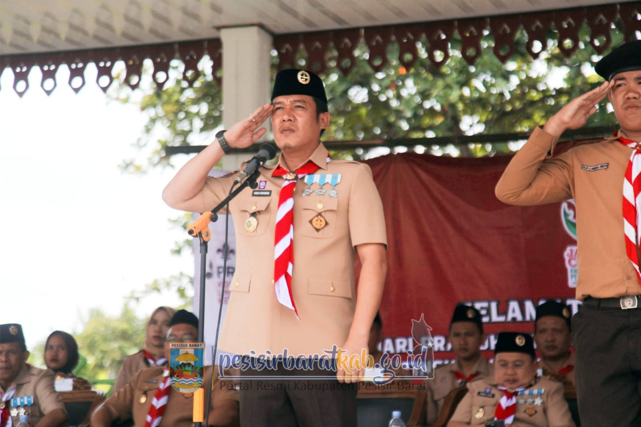 PESISIR BARAT-Bupati Pesisir Barat (Pesibar) sekaligus Ketua Majelis Pimpinan Cabang (Kamabicab) Gerakan Pramuka Pesibar, Dedi Irawan, menghadiri sekaligus menutup kegiatan Perkemahan Jambore Cabang Ke-1, di Lapangan Merdeka Labuhan Jukung Kecamatan Pesisir Tengah, Rabu (17/9/2025).