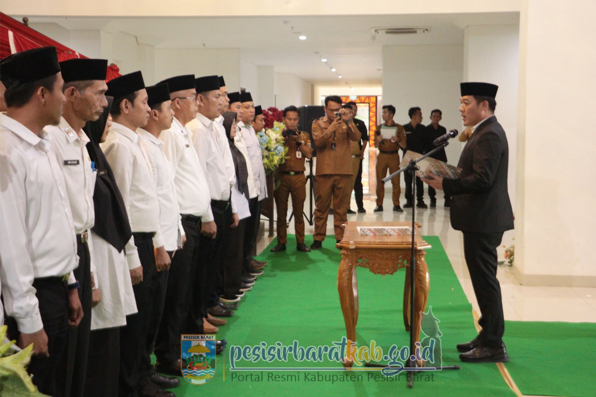PESISIR BARAT-Bupati Pesisir Barat (Pesibar), Dedi Irawan mengukuhkan pengurus Lembaga Pengembangan Tilawatil Quran (LPTQ) Pesibar periode 2025-2030, di Lobi Lantai 1 Gedung Marga Sai Batin Komplek Perkantoran Pemkab Pesibar, Senin (20/10/2025).