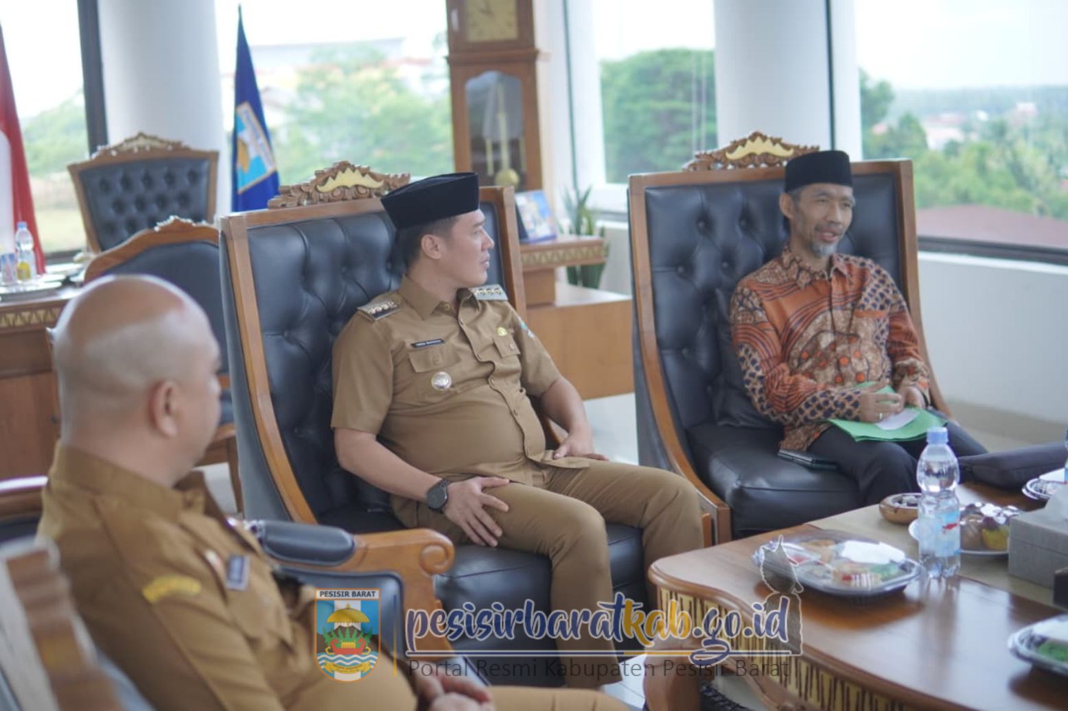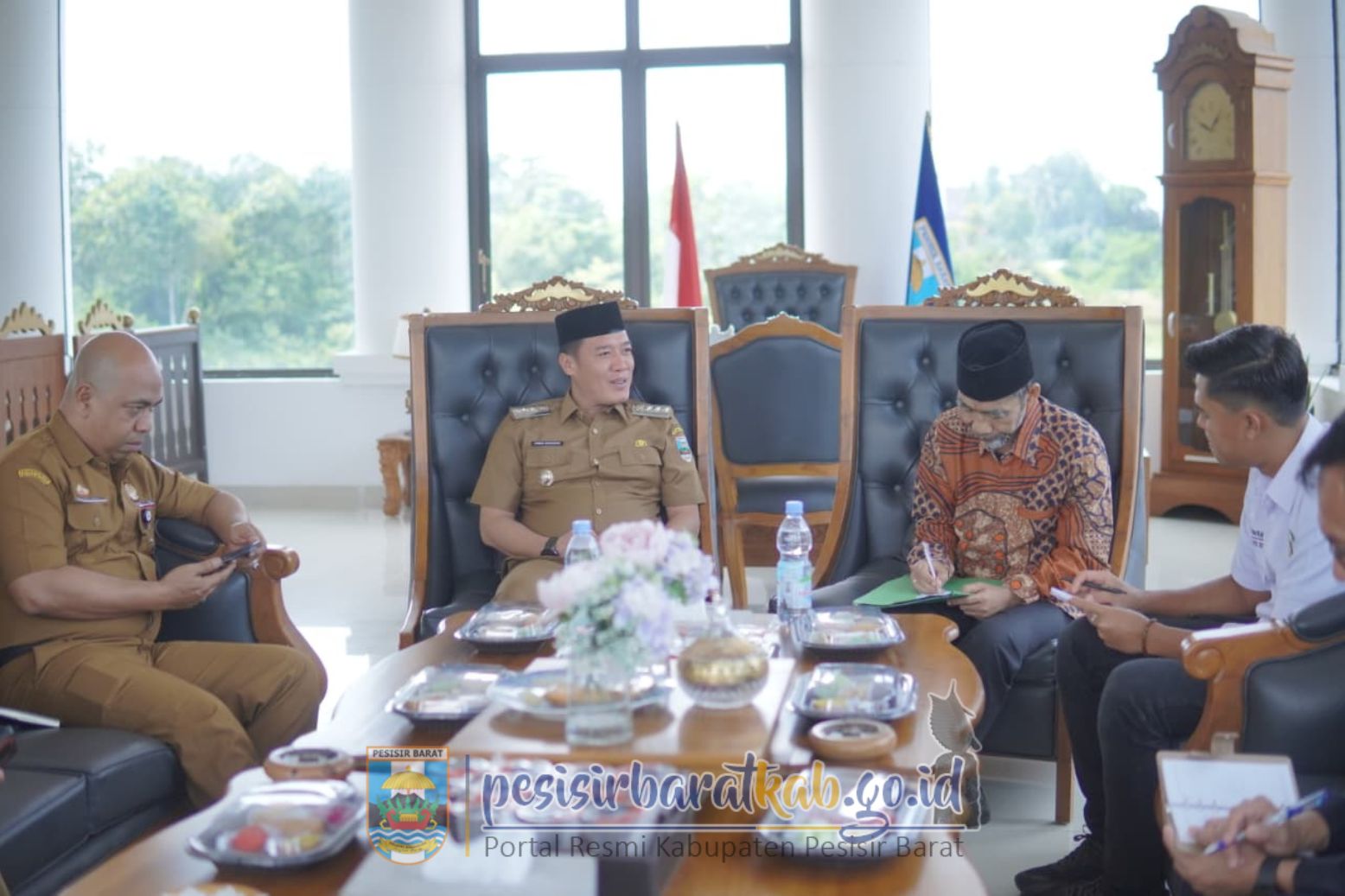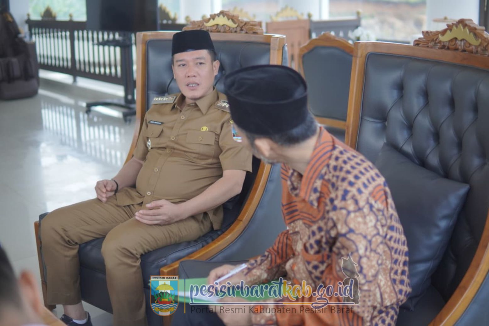 PESISIR BARAT-Bupati Pesisir Barat (Pesibar), Dedi Irawan, menyambut secara langsung Kunjungan Kerja (Kunker) anggota Dewan Perwakilan Daerah-Republik Indonesia (DPD RI) KH. Ir. Abdul Hakim, M.M., di Lantai 5 Gedung Marga Sai Batin Komplek Perkantoran Pemkab Pesibar, Selasa (7/10/2025).