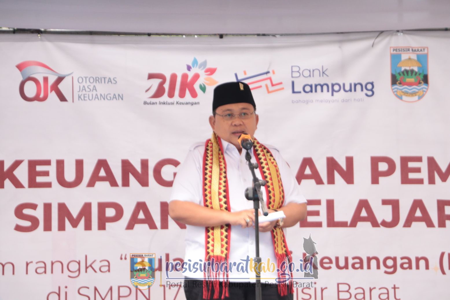 PESISIR BARAT-Wakil Bupati Pesisir Barat (Pesibar), Irawan Topani, S.H., M.Kn., membuka kegiatan edukasi keuangan dan pembukaan rekening Simpanan Pelajar (Simpel), di SMPN 17 Krui Kecamatan Way Krui, Rabu (22/10/2025).
