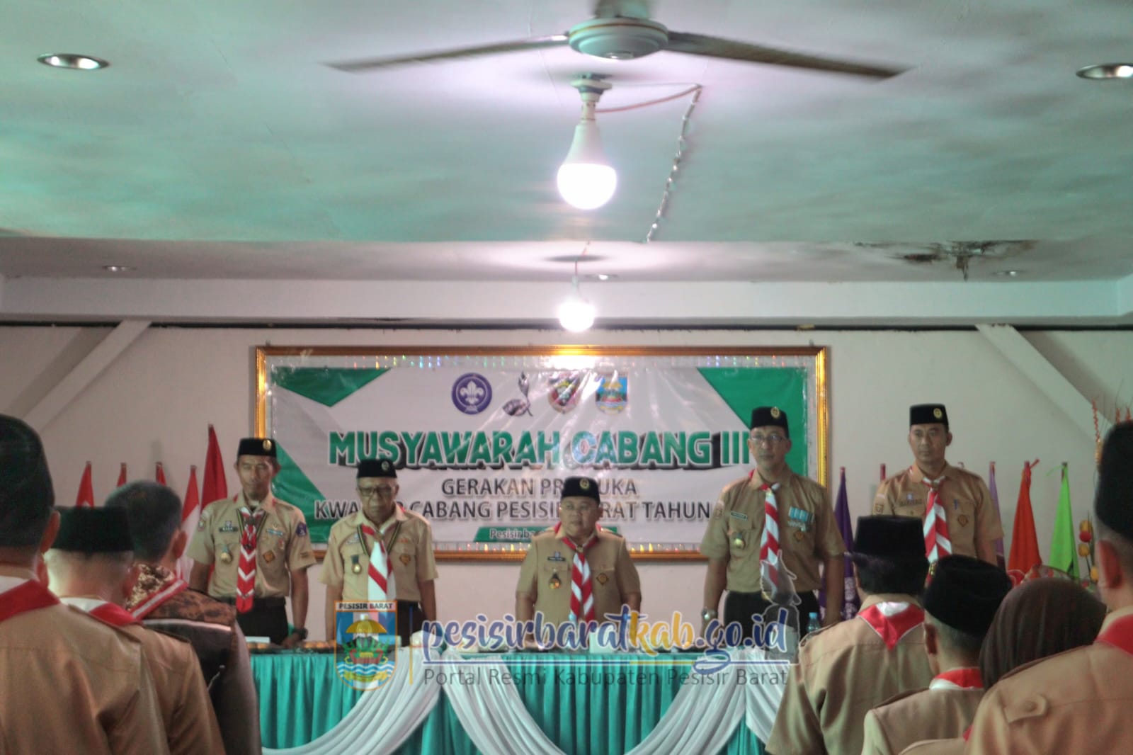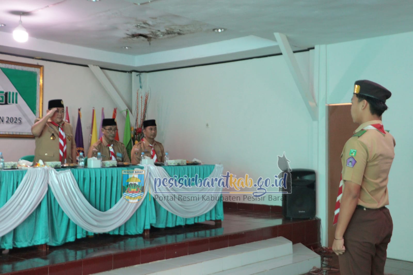 PESISIR BARAT-Wakil Bupati Pesisir Barat (Pesibar), Irawan Topani, S.H., M.Kn., menghadiri kegiatan Musyawarah Cabang (Muscab) ke III Kwartir Cabang (Kwarcab) Gerakan Pramuka Pesibar, di Gedung Pramuka, Rabu (2/7/2025).