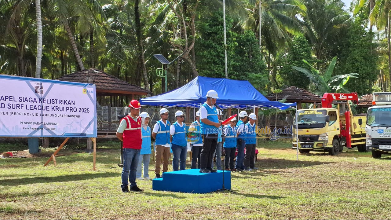 PESISIR BARAT-Wakil Bupati Pesisir Barat (Pesibar), Irawan Topani, S.H., M.Kn., menghadiri Apel Siaga Event World Surf League (WSL) Krui Pro Qualifying Series (QS) 6000 Tahun 2025, di Pantai Tanjung Setia Kecamatan Pesisir Selatan, Sabtu (7/6/2025).