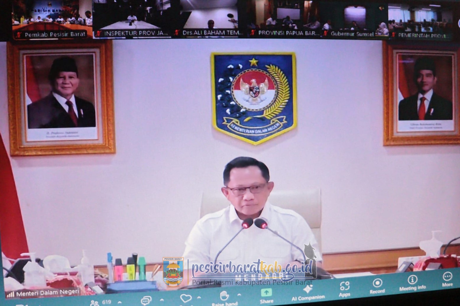 PESISIR BARAT-Wakil Bupati Pesisir Barat (Pesibar), Irawan Topani, S.H., M.Kn., mengikuti Rapat Koordinasi Evaluasi Realisasi Anggaran Pendapatan dan Belanja Daerah (APBD) Provinsi, Kabupaten, dan Kota se-Indonesia Tahun Anggaran 2025 yang digelar oleh Kementerian Dalam Negeri (Kemendagri), melalui zoom meeting dari ruang Batu Gukhi Lantai 1 Gedung Marga Sai Batin Komplek Pemkab Pesibar, Rabu (24/12/2025).