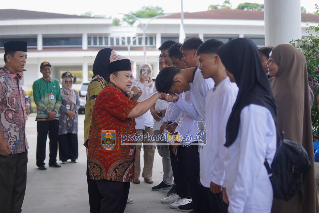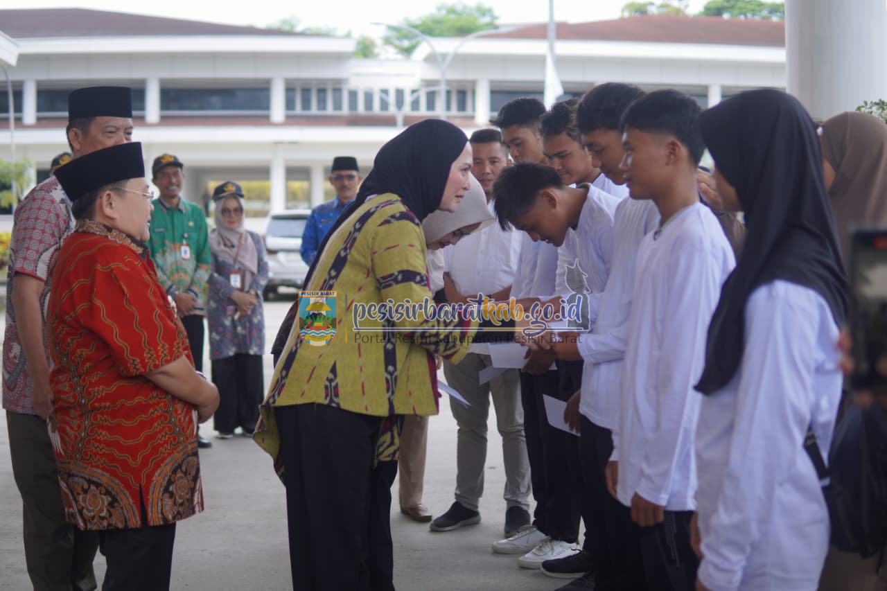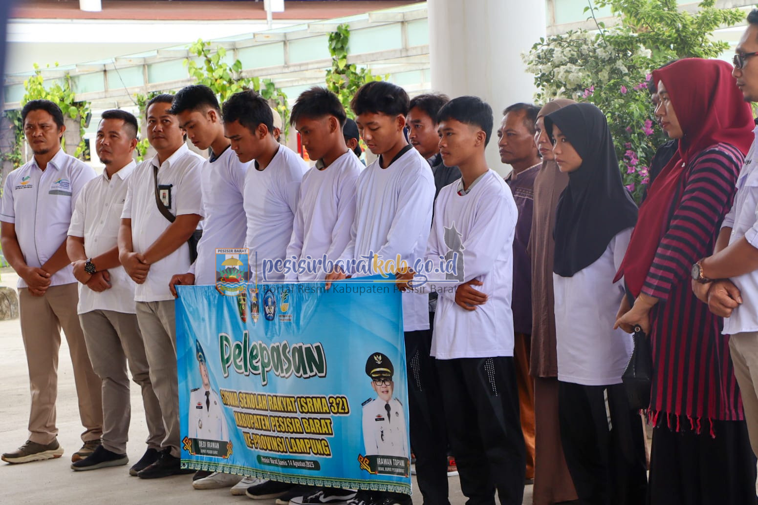 PESISIR BARAT-Wakil Bupati Pesisir Barat (Pesibar), Irawan Topani, S.H., M.Kn., melepas siswa asal Pesibar yang akan mengikuti pendidikan di Sekolah Rakyat SRMA 32 Provinsi Lampung, Selasar Gedung Marga Sai Batin Komplek Perkantoran Pemkab Pesibar, Kamis (14/8/2025).