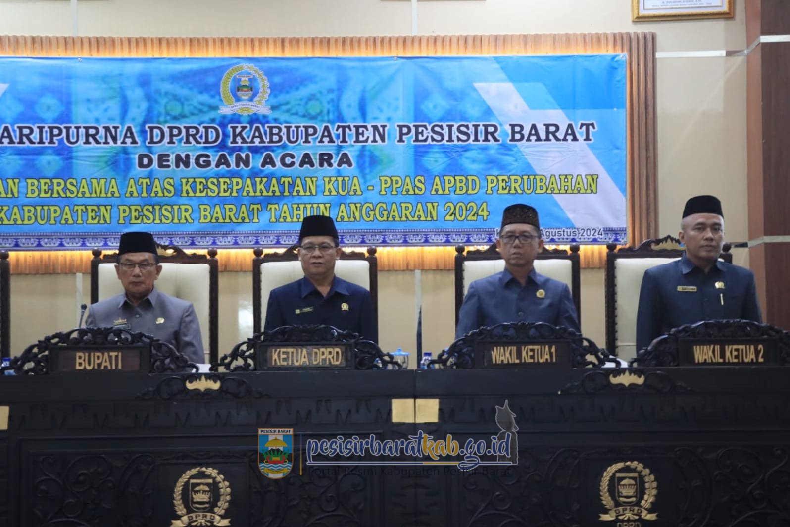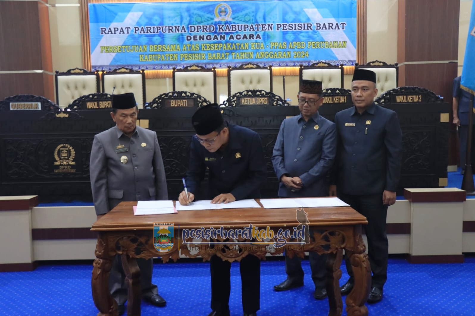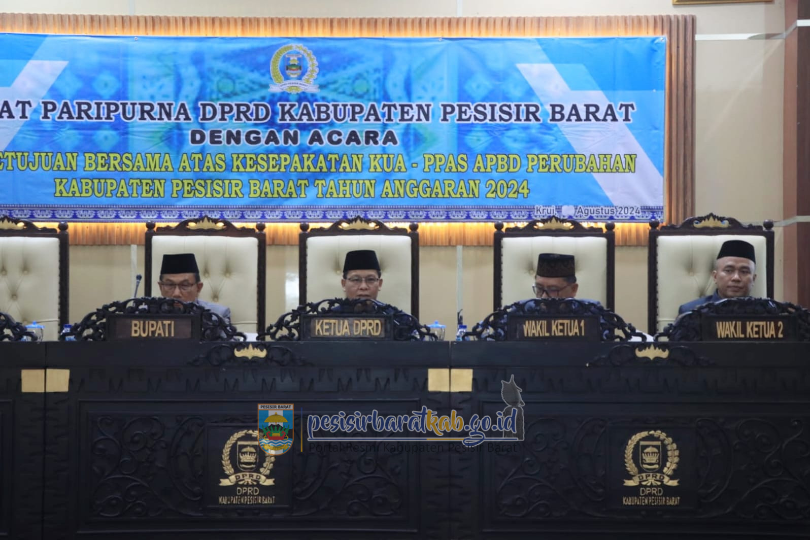 PESISIR BARAT-Kepala Dinas Komunikasi, Informatika, Statistik, dan Persandian (Diskominfotiksan), Suryadi, S.IP., M.M., menginformasikan bahwa, Wakil Bupati Pesisir Barat (Pesibar), A. Zulqoini Syarif, S.H., menghadiri rapat Paripurna Dewan Perwakilan Rakyat Daerah (DPRD) dengan agenda Penandatanganan Nota Kesepakatan Perubahan Kebijakan Umum Anggaran - Perubahan Prioritas dan Plafon Anggaran Sementara (KUA-PPAS) Anggaran Pendapatan dan Belanja Daerah (APBD) Tahun Anggaran 2024, di ruang rapat paripurna DPRD Pesibar, Rabu (31/7/2024).