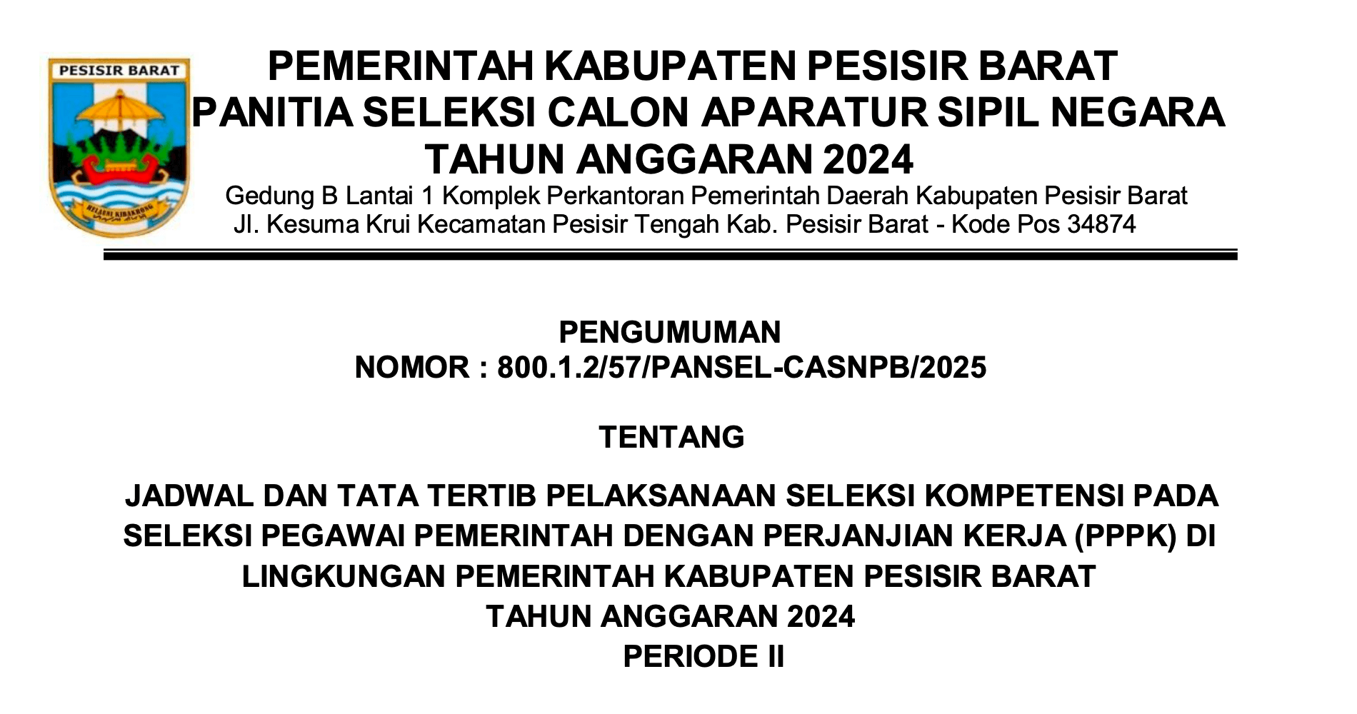 Berdasarkan Surat Deputi Bidang Sistem Informasi dan Digitalisasi Manajemen ASN BKN Nomor : 6155/B-KS.04.01/SD/E/2025 tanggal 11 April 2025 Hal Penyampaian Jadwal Seleksi Kompetensi PPPK T.A. 2024 Tahap II di Lokasi Dalam Negeri dan Surat Deputi Bidang Sistem Informasi dan Digitalisasi Manajemen ASN BKN Nomor : 6540/B-KS.04.01/SD/E/2025 tanggal 30 April 2025 Hal Penyampaian Jadwal Seleksi Pengadaan PPPK T.A. 2024 Tahap II, bersama ini disampaikan tempat dan waktu pelaksanaan Seleksi Kompetensi pada Seleksi Pegawai Pemerintah dengan Perjanjian Kerja (PPPK) di Lingkungan Pemerintah Kabupaten Pesisir Barat Tahun Anggaran 2024 Periode II.