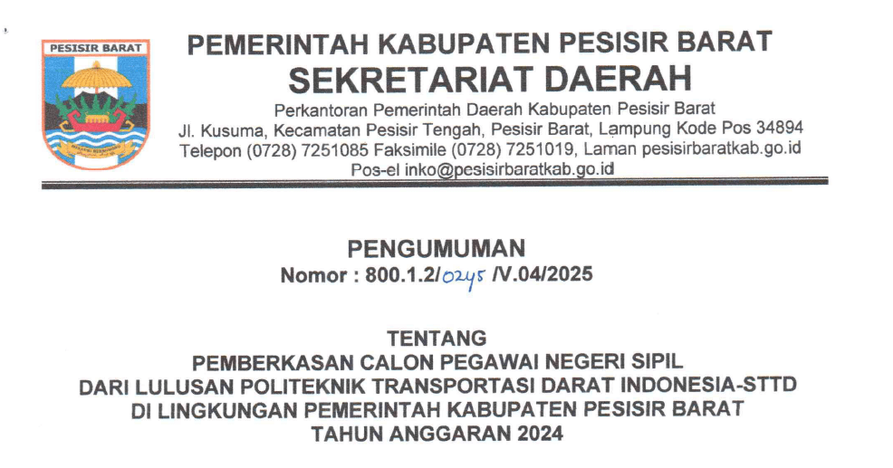 Berdasarkan Surat Keputusan Menteri Pendayagunaan Aparatur Negara dan Reformasi Birokrasi Nomor 656 Tahun 2024 tentang Penetapan Kebutuhan Pegawai Negeri Sipil dari lulusan Politeknik Transportasi Darat Indonesia-STTD di Lingkungan Instansi Daerah Tahun Anggaran 2024, bersama ini kami sampaikan Pengumuman Pemberkasan Calon Pegawai Negeri Sipil dari Lulusan Politeknik Transportasi Darat Indonesia-STTD di Lingkungan Pemerintah Kabupaten Pesisir Barat Tahun Anggaran 2024.