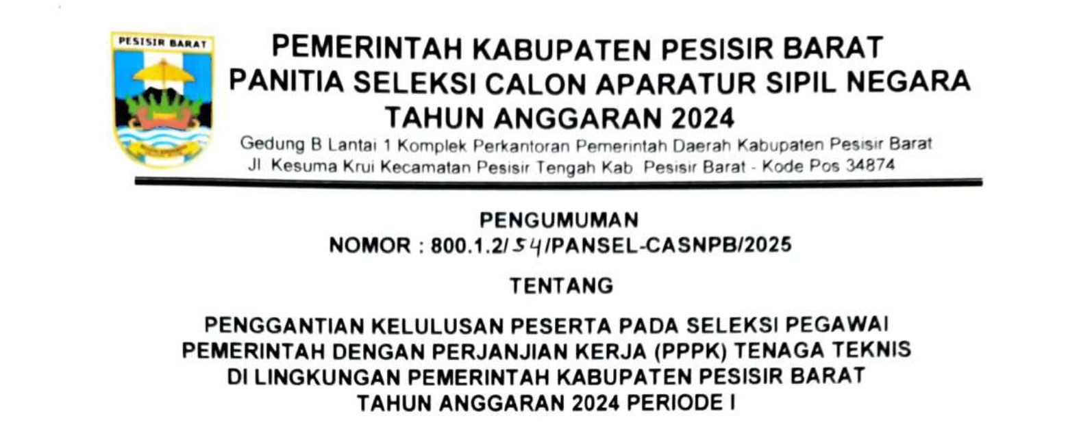 Merujuk pada Pengumuman Nomor : 800.1.2/53/V.04/2025 tanggal 25 Maret 2025 tentang Pembatalan Kelulusan Peserta Seleksi Calon Pegawai Pemerintah dengan Perjanjian Kerja (PPPK) Tenaga Teknis di Lingkungan Pemerintah Kabupaten Pesisir Barat Tahun Anggaran 2024 Periode I, bersama ini disampaikan Pengumuman Penggantian Kelulusan Peserta pada Seleksi Pegawai Pemerintah dengan Perjanjian Kerja (PPPK) Tenaga Teknis di Lingkungan Pemerintah Kabupaten Pesisir Barat Tahun Anggaran 2024 Periode I.