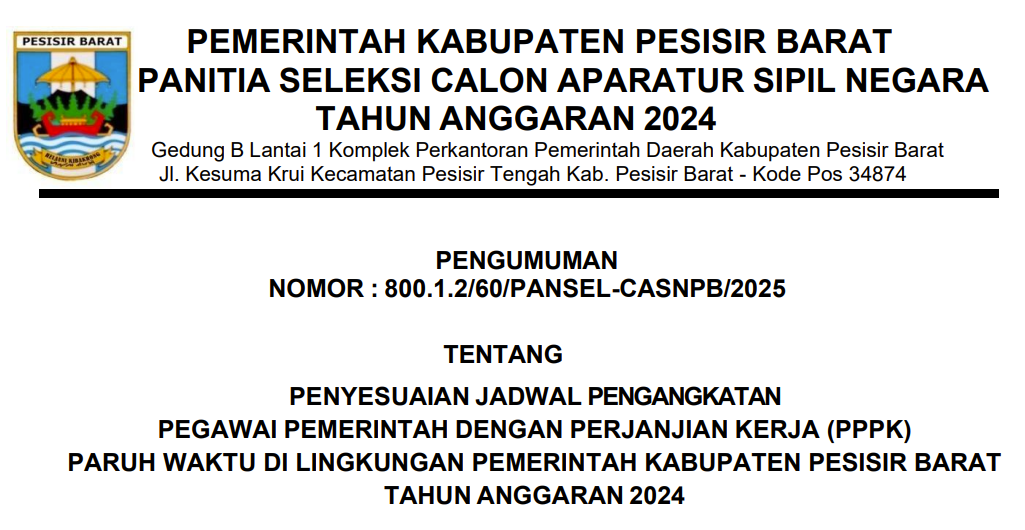 PENYESUAIAN JADWAL PENGANGKATAN PEGAWAI PEMERINTAH DENGAN PERJANJIAN KERJA (PPPK) PARUH WAKTU DI LINGKUNGAN PEMERINTAH KABUPATEN PESISIR BARAT TAHUN ANGGARAN 2024