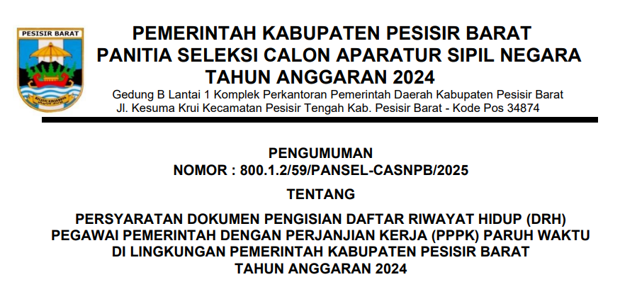 Berdasarkan Surat Kepala Badan Kepegawaian Negara Republik Indonesia Nomor : 13649/B-SI.01.01/SD/K/2025 tanggal 6 September 2025 perihal Penyampaian Daftar Peserta Alokasi PPPK Paruh Waktu, bersama ini disampaikan Pengumuman Persyaratan Dokumen Pengisian Daftar Riwayat Hidup (DRH) Pegawai Pemerintah dengan Perjanjian Kerja (PPPK) Paruh Waktu di Lingkungan Pemerintah Kabupaten Pesisir Barat Tahun Anggaran 2024
