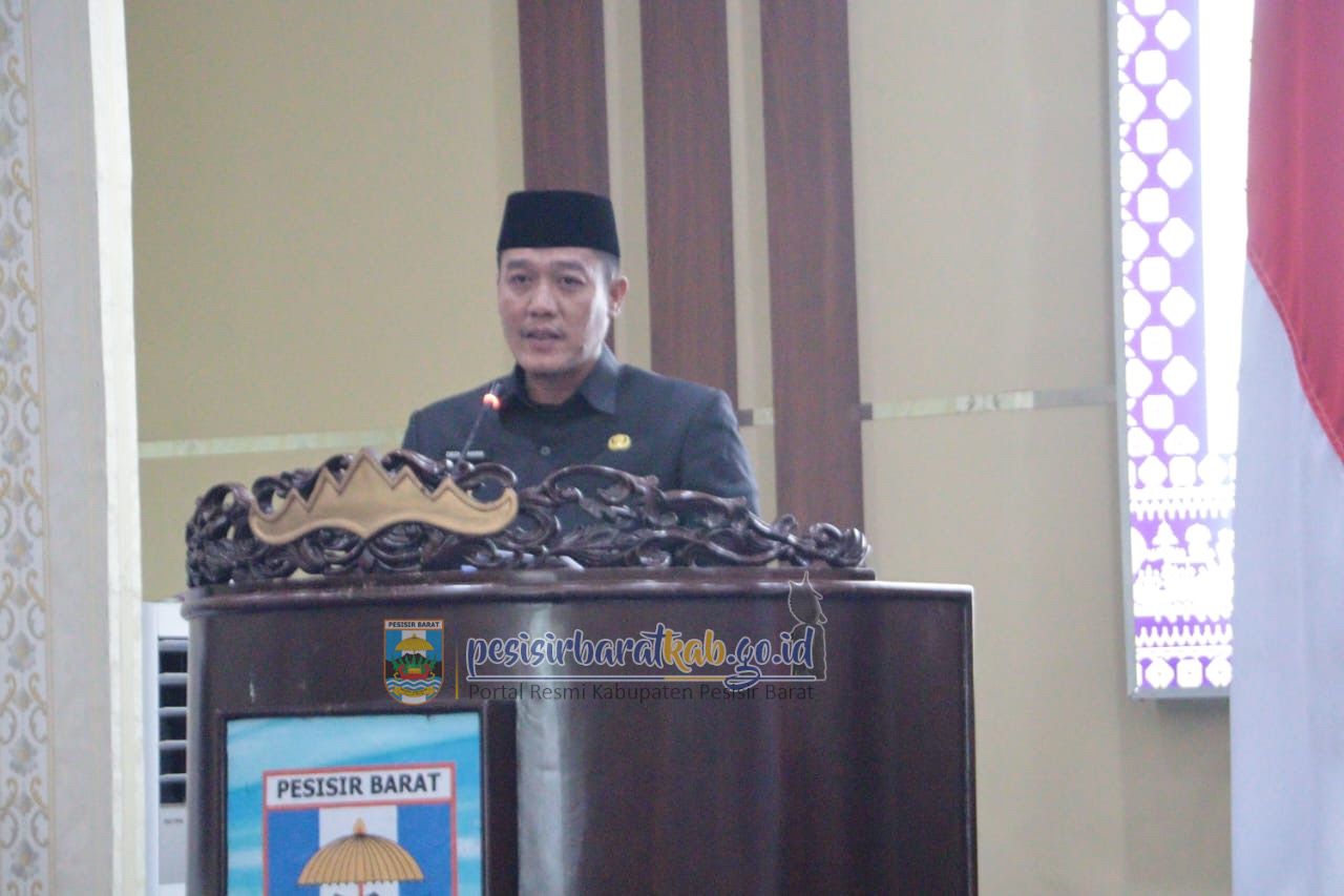 PESISIR BARAT-Bupati Pesisir Barat (Pesibar), Dedi Irawan, menghadiri rapat paripurna Dewan Perwakilan Rakyat Daerah (DPRD) dengan agenda Penyampaian Nota Keuangan Rancangan Peraturan Daerah (Ranperda) Pertanggungjawaban Pelaksanaan Anggaran Pendapatan dan Belanja Daerah (APBD) Pesibar Tahun 2024, di ruang rapat paripurna DPRD Pesibar, Selasa (8/7/2025).
