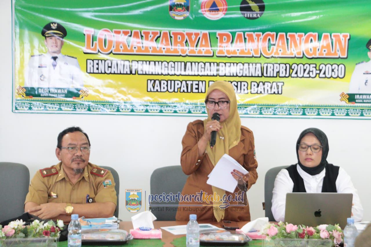 PESISIR BARAT-Staf Ahli Bupati Bidang Pemerintahan, Hukum dan Politik Sekretariat Pemerintah Kabupaten (Pemkab) Pesisir Barat (Pesibar), Yurni Dewi, S.Pd., membuka kegiatan Lokakarya Rancangan Rencana Penanggulangan Bencana (RPB) Pesibar 2025-2030, di ruang rapat Sekda Lantai 3 Gedung Marga Sai Batin Komplek Perkantoran Pemkab Pesibar, Senin (7/7/2025).