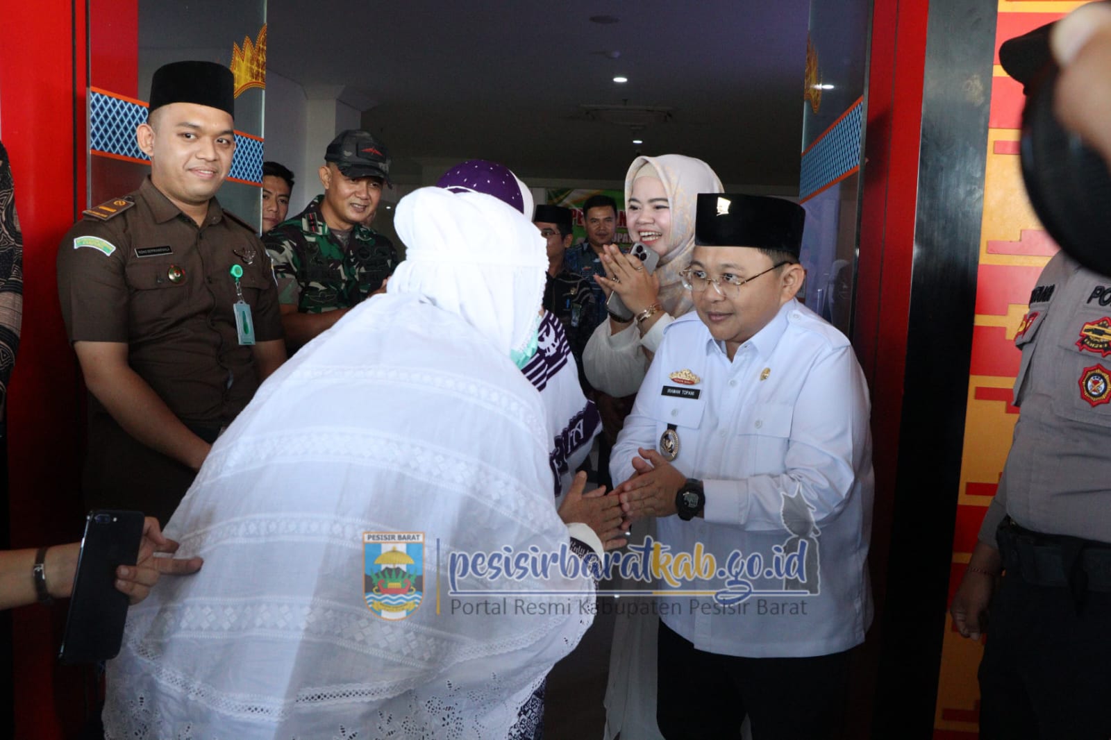 PESISIR BARAT-Wakil Bupati Pesisir Barat (Pesibar), Irawan Topani, S.H., M.Kn., menyambut kedatangan 56 orang rombongan jamaah haji yang baru kembali ke tanah air pasca melaksanakan seluruh rangkaian ibadah haji.