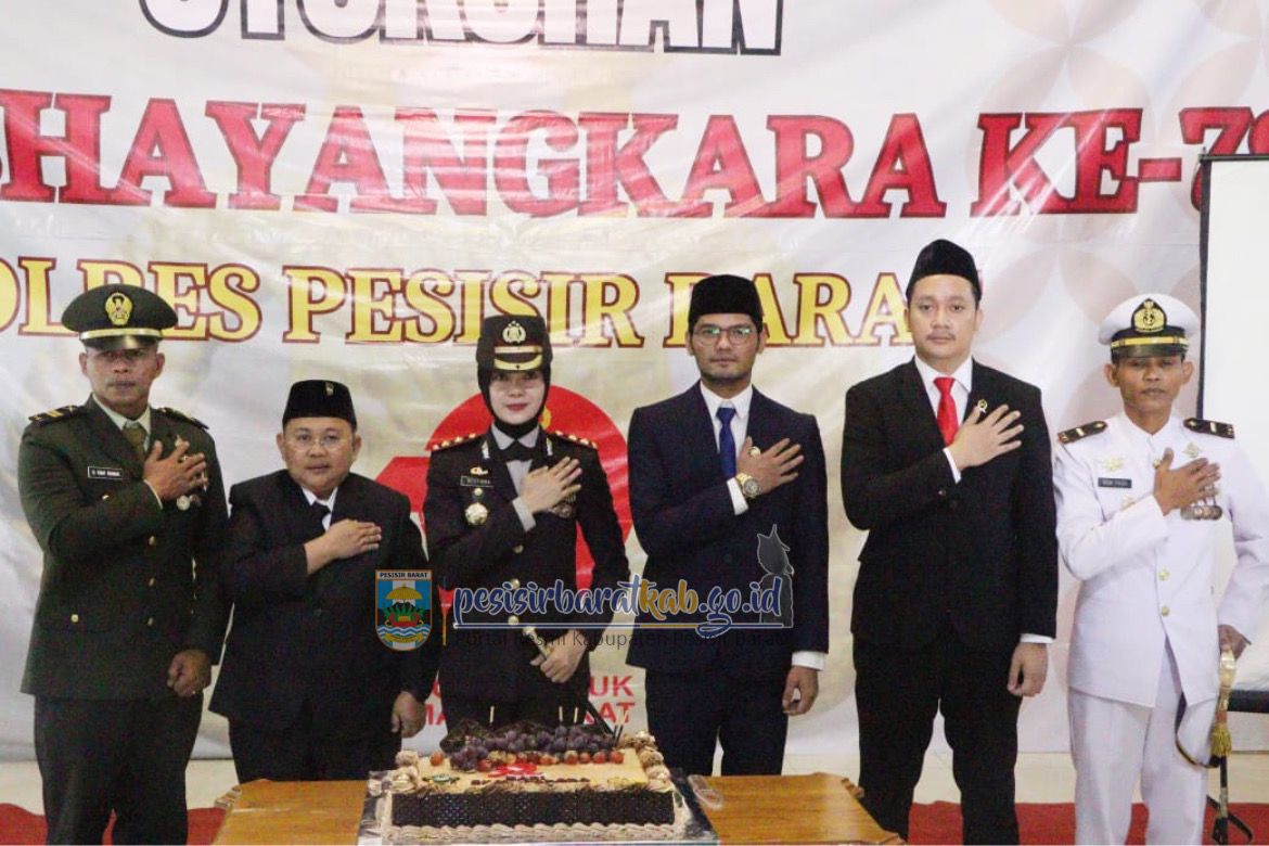 PESISIR BARAT-Wakil Bupati Pesisir Barat (Pesibar), Irawan Topani, S.H., M.Kn., menghadiri kegiatan syukuran peringatan Hari Bhayangkara ke-79, di Lobi Lantai 1 Gedung Marga Sai Batin Komplek Perkantoran Pemkab Pesibar, Selasa (1/7/2025).