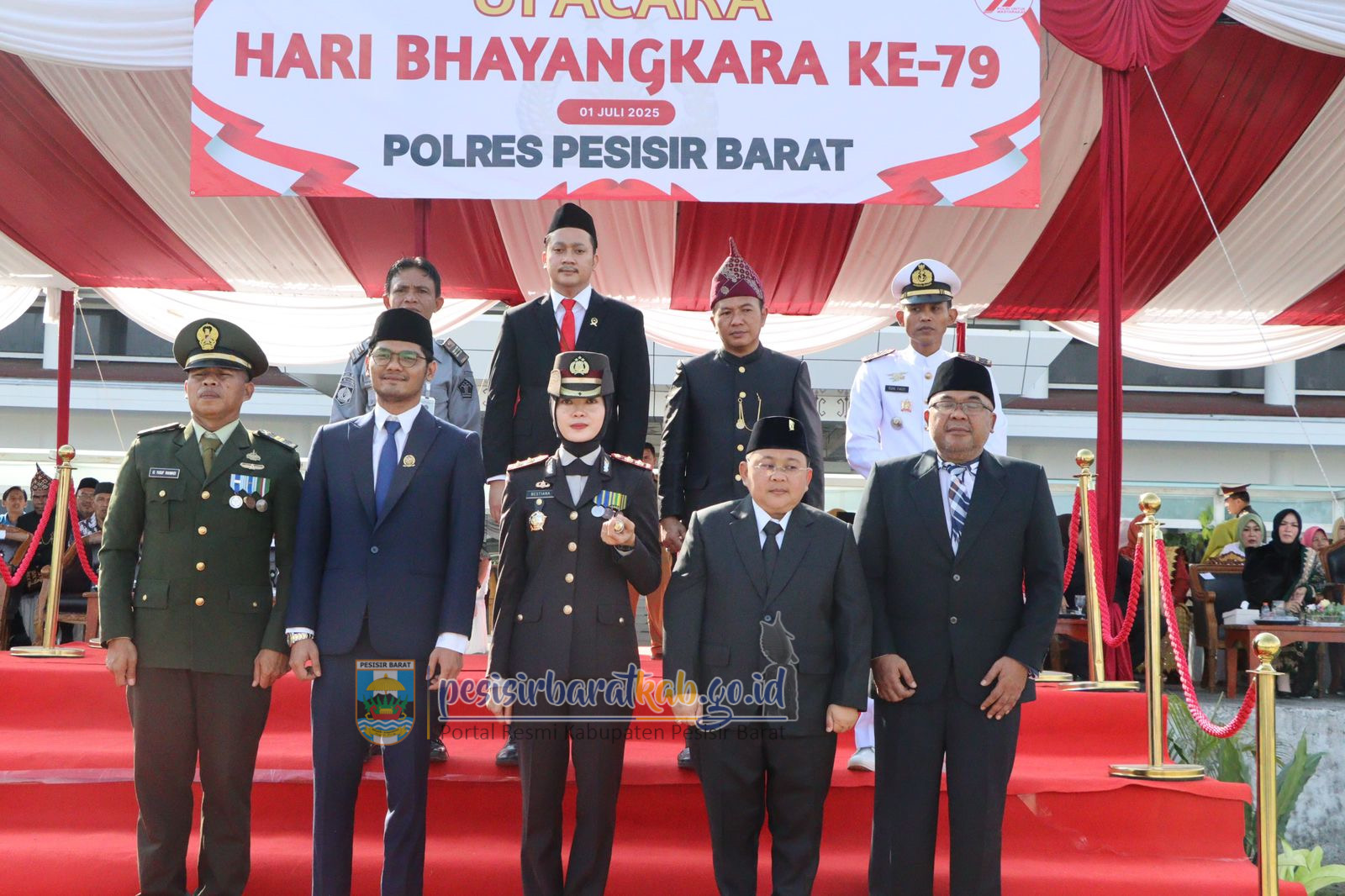 PESISIR BARAT-Wakil Bupati Pesisir Barat (Pesibar), Irawan Topani, S.H., M.Kn., menghadiri Upacara Peringatan Hari Bhayangkara ke-79, di Halaman Komplek Perkantoran Pemkab Pesibar, Selasa (1/7/2025).