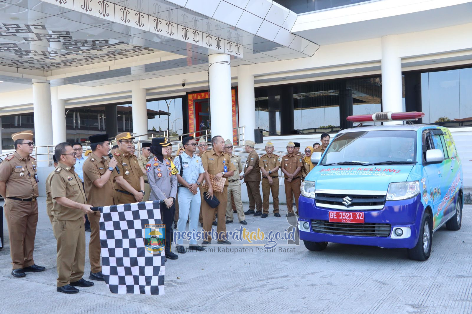 PESISIR BARAT-Bupati Pesisir Barat (Pesibar), Dedi Irawan menyerahkan secara simbolis mobil Sistem Administrasi Manunggal Satu Atap (Samsat) Keliling kepada Badan Pendapatan Daerah (Bapenda) Provinsi Lampung, di Selasar Komplek Perkantoran Pemkab Pesibar, Senin (16/6/2025).
