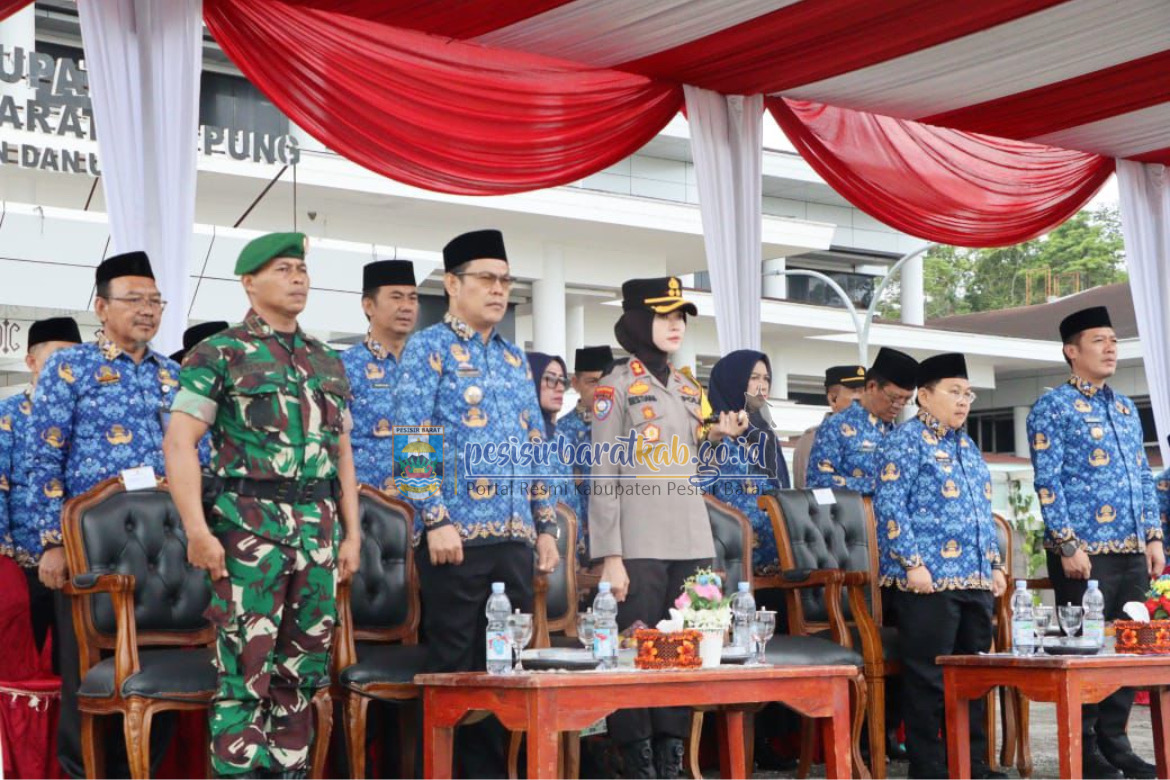 PESISIR BARAT-Bupati - Wakil Bupati Pesisir Barat (Pesibar), Dedi Irawan - Irawan Topani, S.H., M.Kn., menghadiri upacara peringatan hari lahir Pancasila sekaligus Upacara Bulanan, di Halaman Komplek Perkantoran Pemkab Pesibar, Selasa (17/6/2025).
