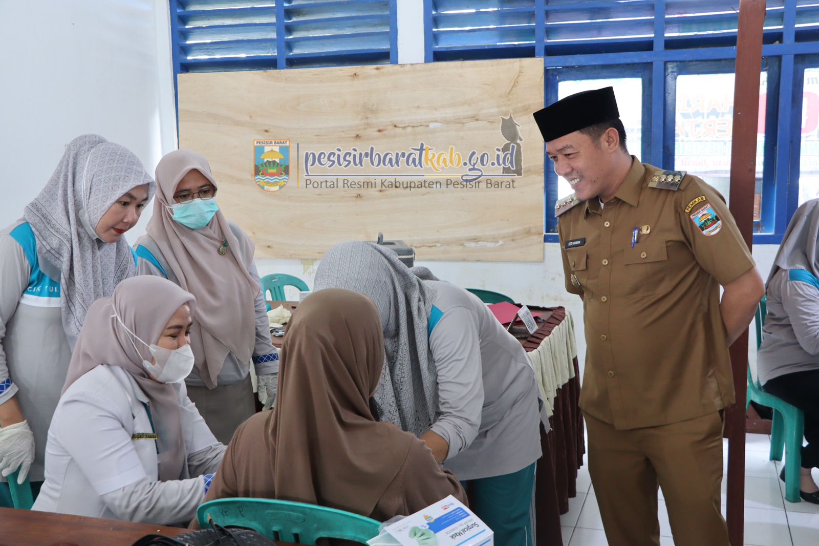 PESISIR BARAT-Wakil Bupati Pesisir Barat (Pesibar), Irawan Topani, S.H., M.Kn., meninjau pelaksanaan Pemberian Vaksinasi dalam rangka pengabdian kepada masyarakat 100 hari kerja Bupati-Wakil Bupati Pesibar, di dua lokasi berbeda yakni Kecamatan Pesisir Utara dan Lemong, Senin (2/6/2025).