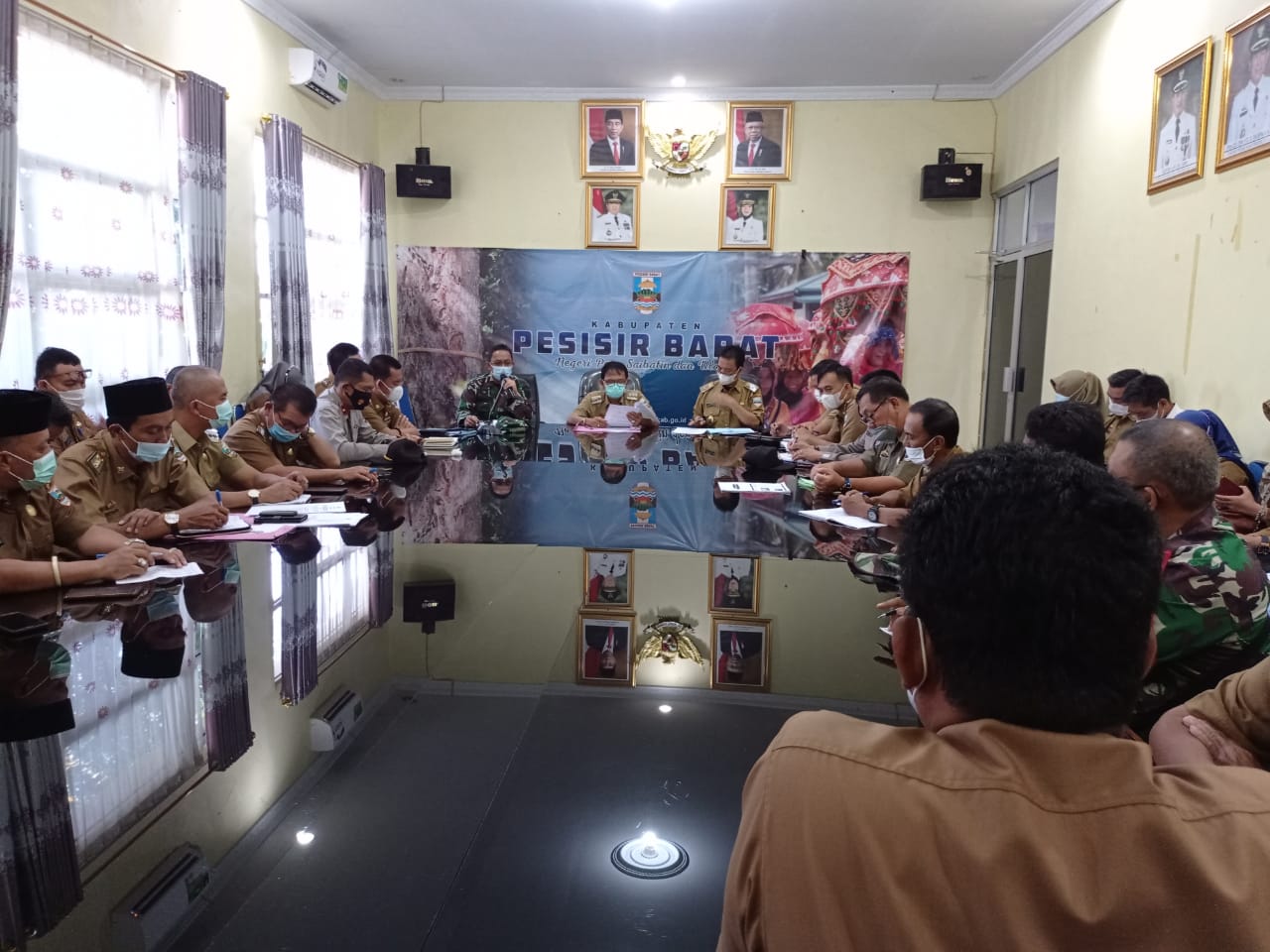 Rapat tersebut dipimpin langsung oleh Bupati Pesisir Barat, DR. Drs. Agus Istiqlal, SH., MH. Selaku Ketua Tim Satgas Covid-19 dan didampingi Asisten I Bidang Pemerintahan Audi Marpi, Spd., MM. Serta diikuti Sekretaris Satgas Covid-19 Syaifullah S.Pi., forkopimda Lampung Barat dan Pesisir Barat, Para Ka. OPD Kab. Pesisir Barat ataupun yang mewakilinya, Camat Se-kabupaten Pesisir Barat.